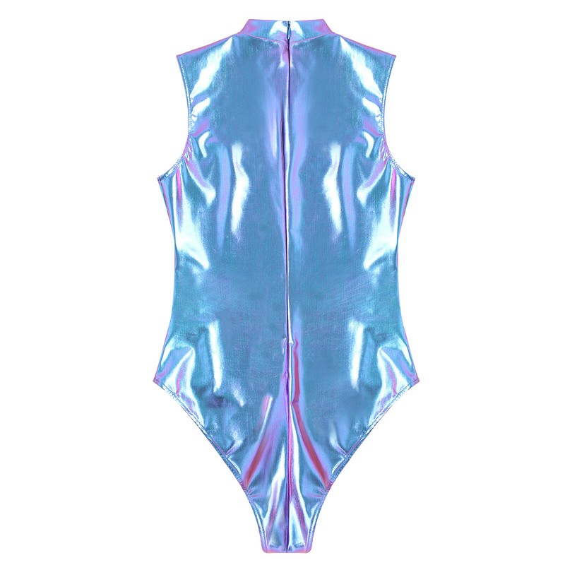 Women Shiny Metallic Bodysuit Sleeveless Cutout Zipper Catsuit High Cut Leotard