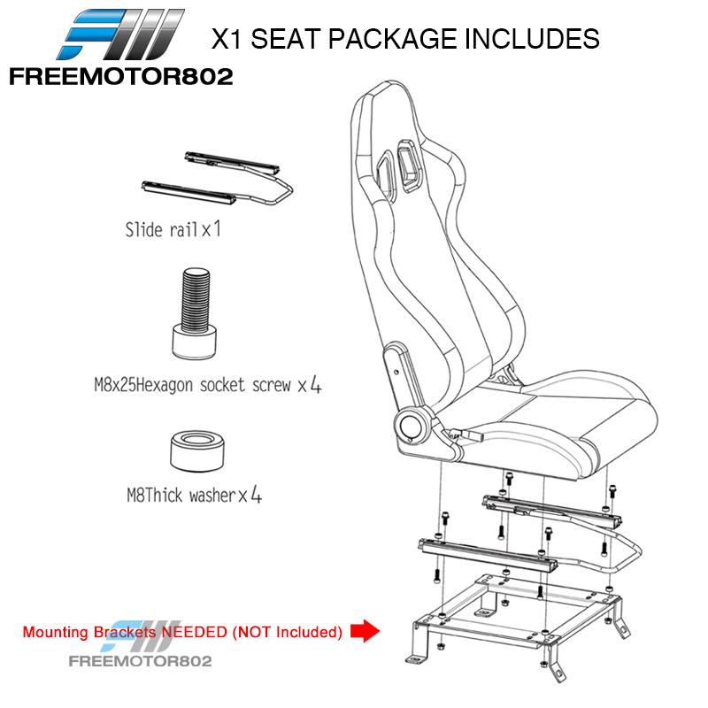 | In the Package | x1 Pair of Racing Seats (Front Driver + Passenger Side) x1 Pair of Dual Sliders Mounting Brackets NOT Included! |
