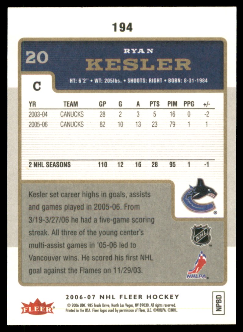 | 2006-07 Fleer 194 Ryan Kesler | ||||||||||||||||