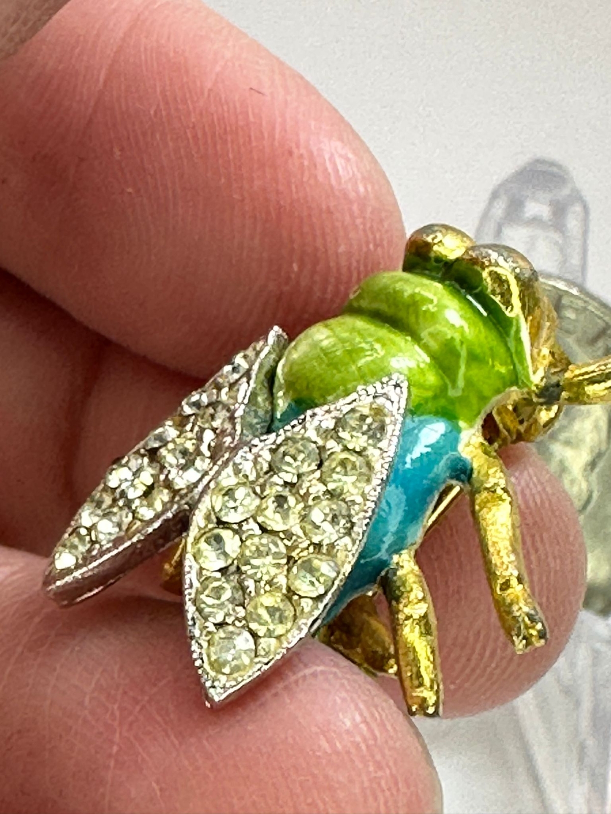 Bee Green Enamel Clear Crystals Vintage Bi-Metal Brooch Pin M-4969*