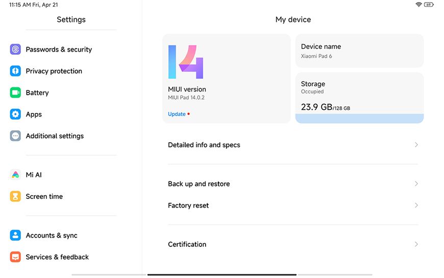 | Model | XIAOMI Mi Pad 6 |