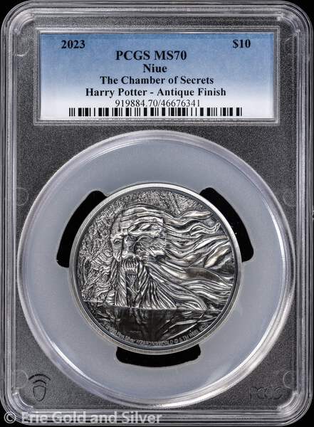 For sale is a 2023 $10 Niue 3 oz Silver Antique Finish Harry Potter: The Chamber of Secrets. Certified / graded by PCGS at MS 70. View pictures for details and condition. There are multiple available, so the coin you receive may not be the exact coin pictured. However, it will be similar quality. Feel free to contact us with any questions.