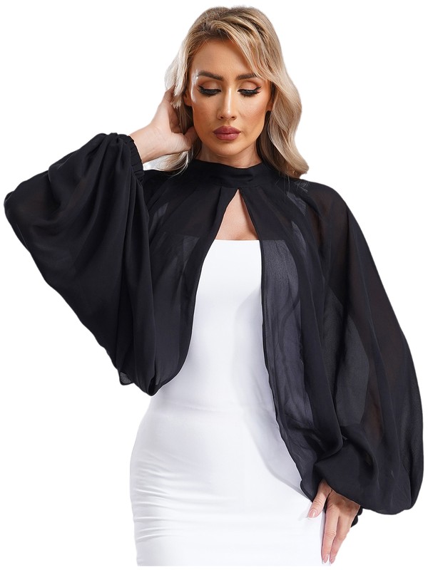 Long sleeve shrug tops for women, mock neck with an o ring for a decoration, cropped length, pull on closure.