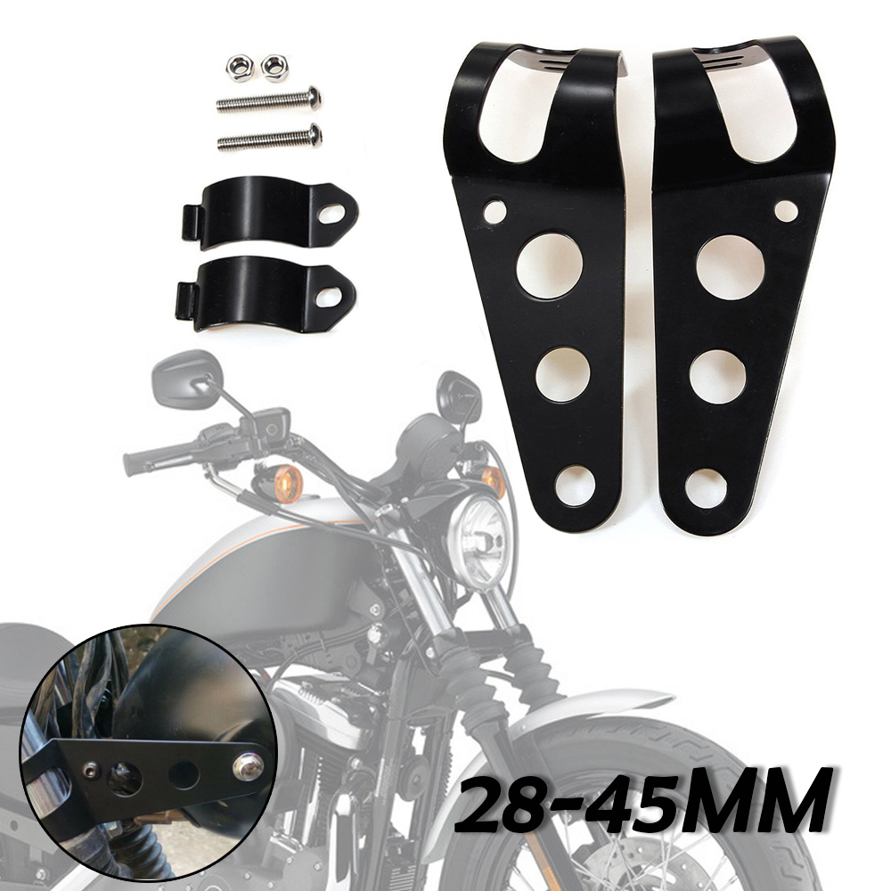 • These custom headlight mounts are Black plated for a super, durable finish. They are fully adjustable to fit 31-42mm diameter fork tubes. From the center of the fork to the center of the furthest hole it is approximately 4 3/8". Headlight mounting hole is 3/8". Comes with mounting bolts. These are nice quality sturdy & simple styled mounts for that custom chopper, bobber or cafe racer