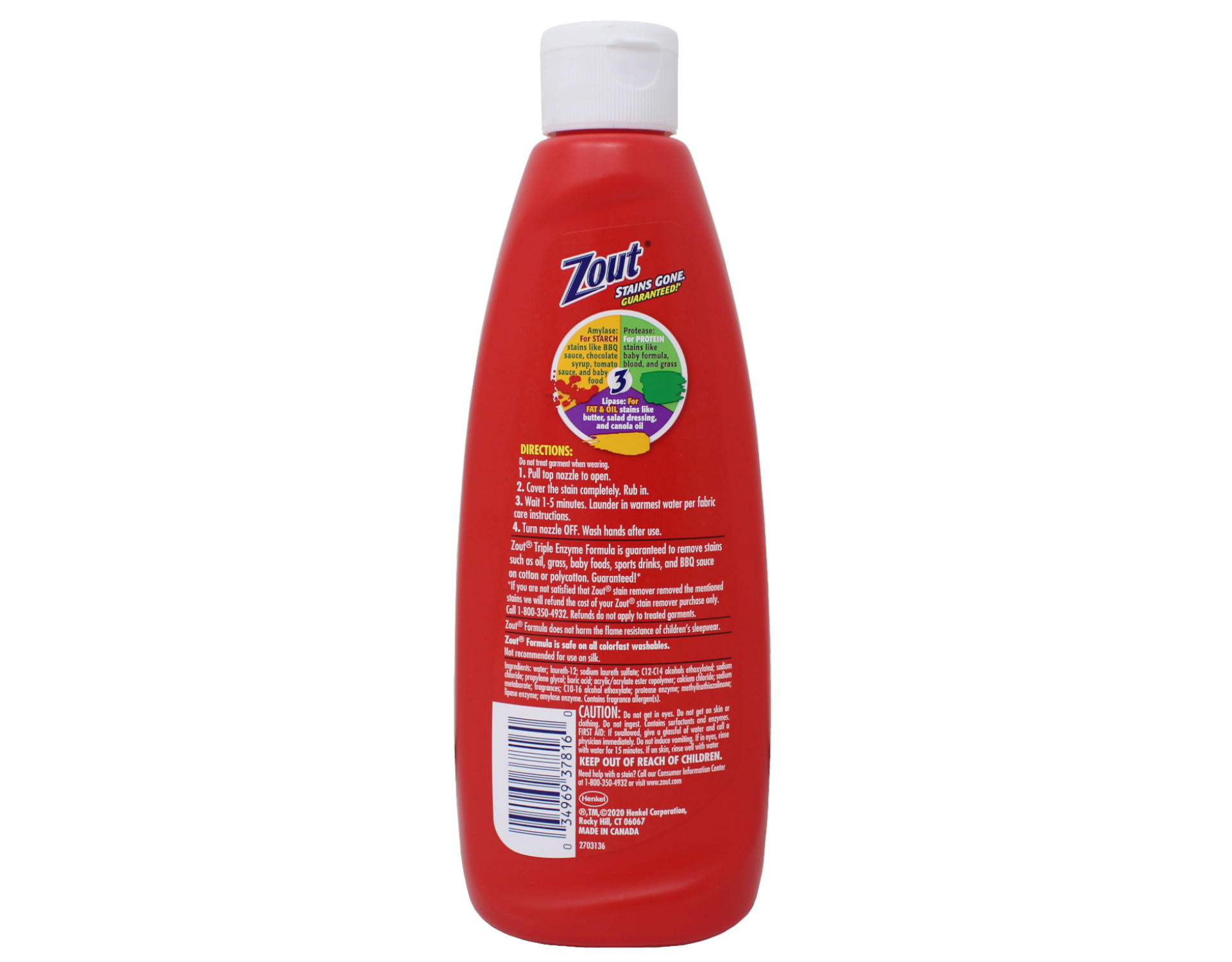 Triple Enzyme Clean technology uses the power of 3 enzymes to remove tough stains like grass, ground-in dirt, blood, foods, and other set-in stains. Zout liquid formula does not harm the flame-resistance of children's sleepware. Safe on all colorfast washables. Not recommended for silk. First enzyme works on blood, grass, sweat and more Second enzyme works on tomato and BBQ sauces Third enzyme targets oily stains 12 Oz.