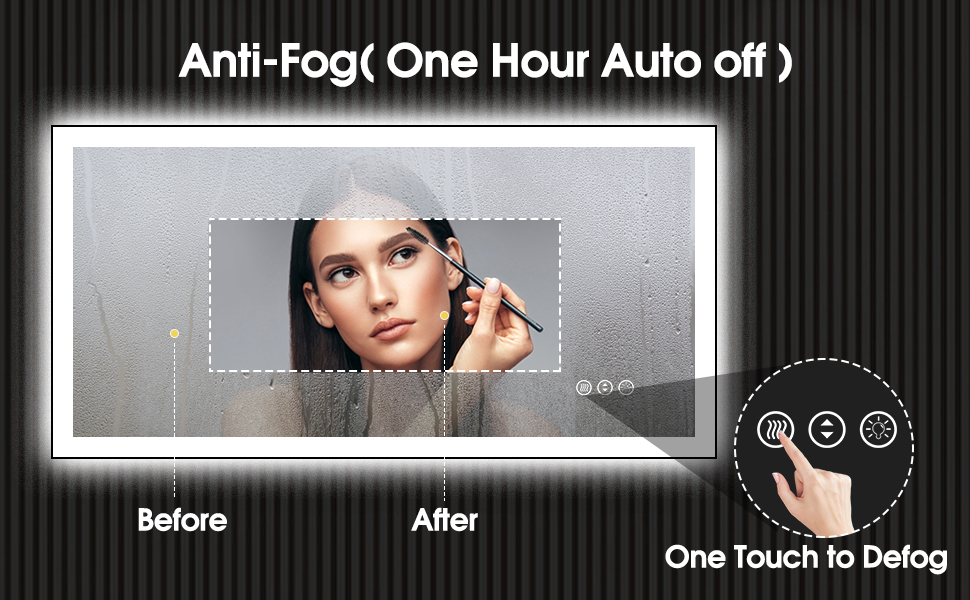 Say goodbye to foggy mirrors after a refreshing shower! Our Framed LED Bathroom Mirror features an anti-fog function that effortlessly clears the steam. Just press the anti-fog button before showering, and you're all set! No need to worry about wiping the mirror afterward. Moreover, the auto turn-off feature deactivates the anti-fog function after 1 hour, ensuring efficient power usage.