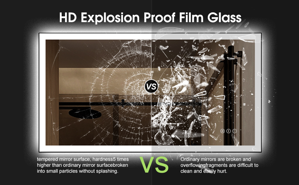 Rest assured with our high-quality materials. The mirror's tempered glass is exceptionally resilient and resistant to breakage, eliminating the risk of dangerous fragments, even if shattered by a hard object. With an IP65 waterproof rating for the bottom box, the mirror is perfectly safe to use in bathrooms. Additionally, top-notch light strips reduce current noise, ensuring a reliable and noise-free lighting experience.