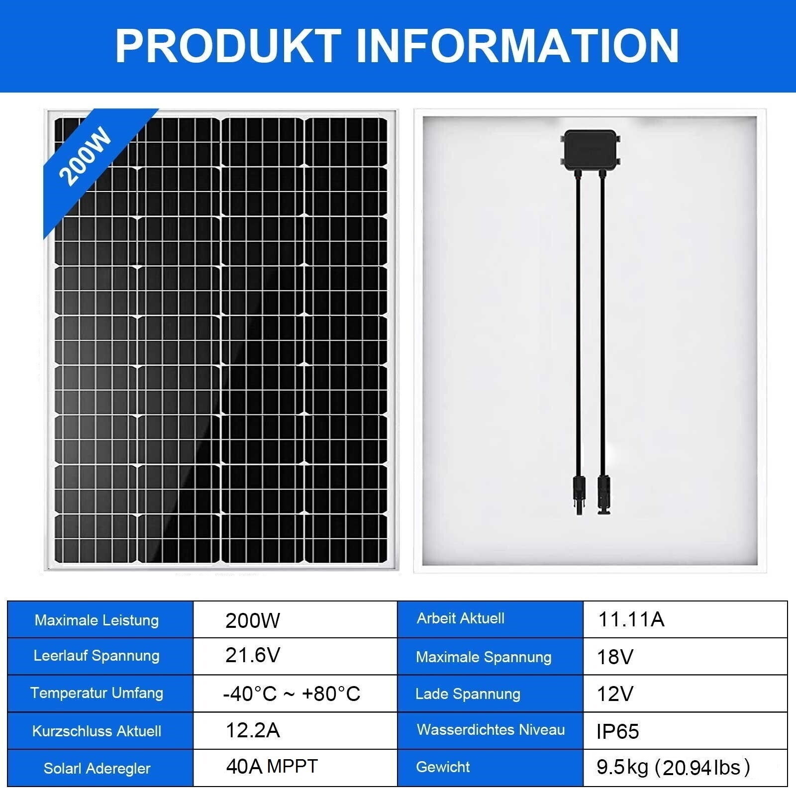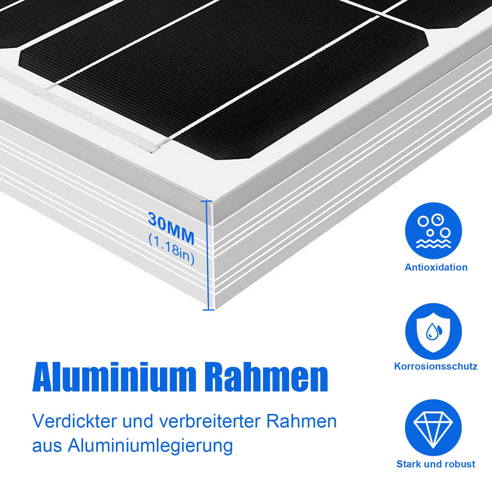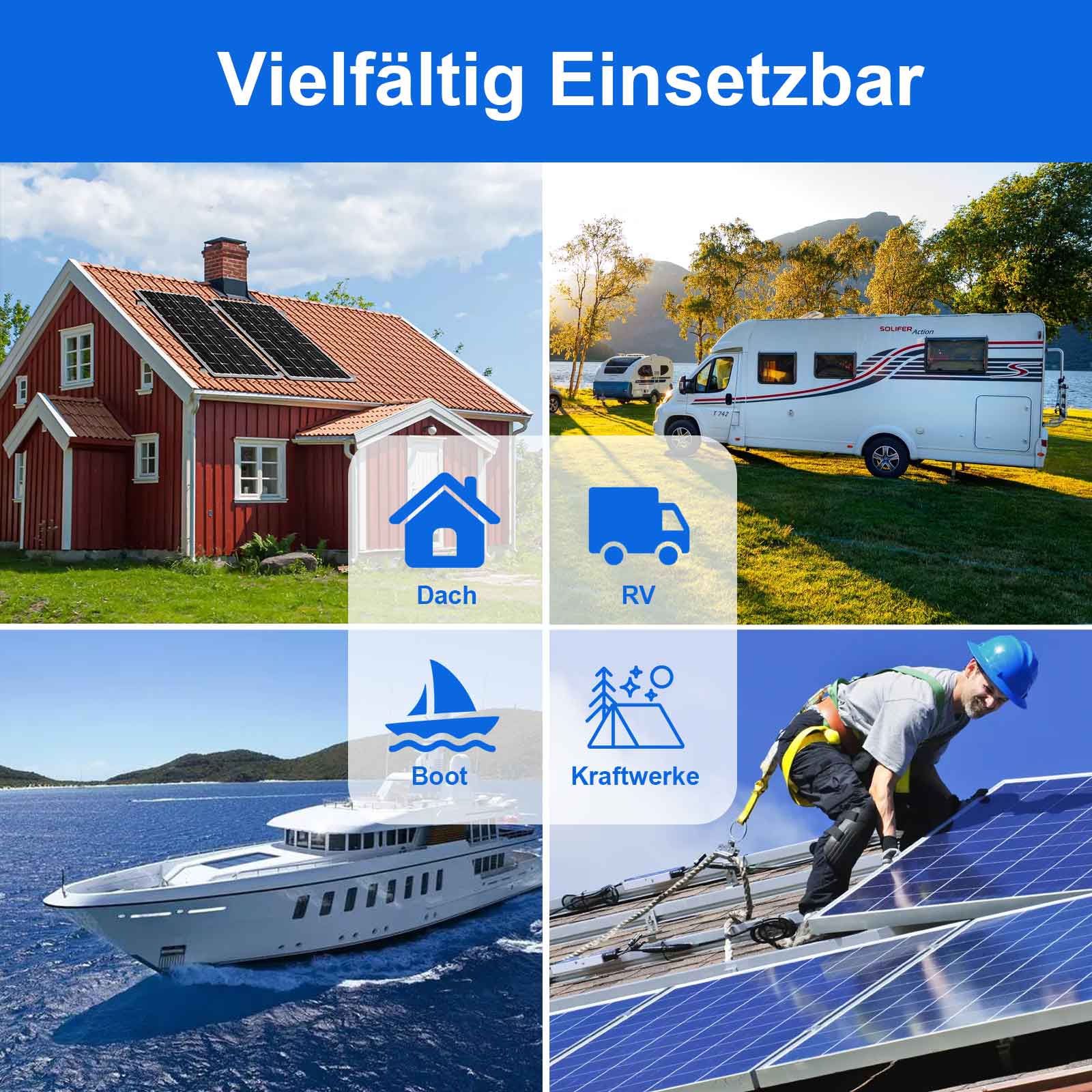 Solaranschlusskabeln und einer Anschlussdose geliefert. So können Sie es installieren, an einen Controller anschließen oder mit Panels erweitern, ohne ins Schwitzen zu geraten. Die Paneele bestehen aus erstklassigen monokristallinen Solarzellen der Klasse A+, die effizienter sind als herkömmliche polykristalline Solarzellen.
