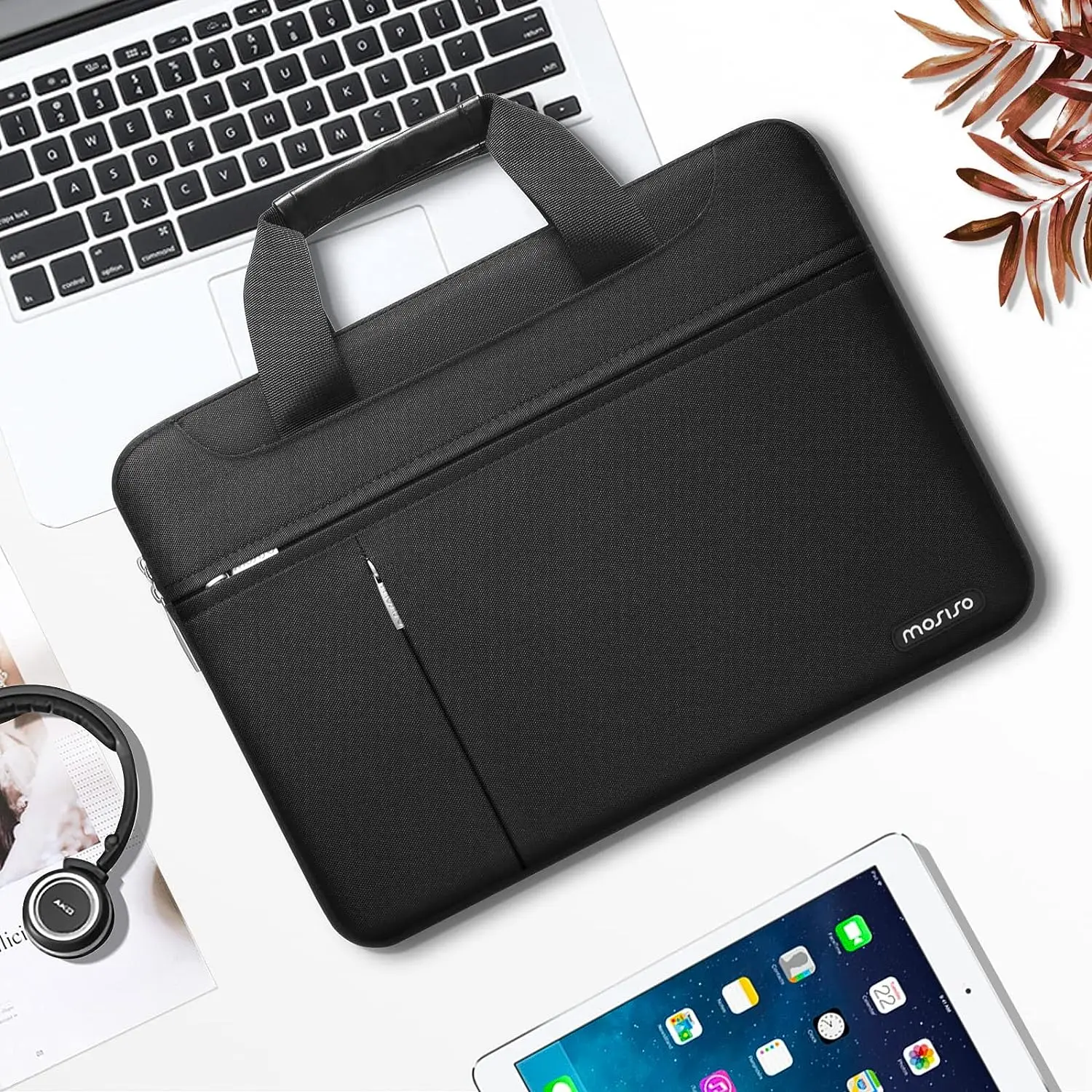 The main inner compartment for laptop. Front horizontal & vertical pockets are great for quick-access items, secure and convenient. Such as tablet, cell phone, pens, wallet, keys and other items. A hidden front top pocket for other precious items. This protective laptop shoulder bag carrying case cover handbag with pocket is ideal for you to take your laptop out.