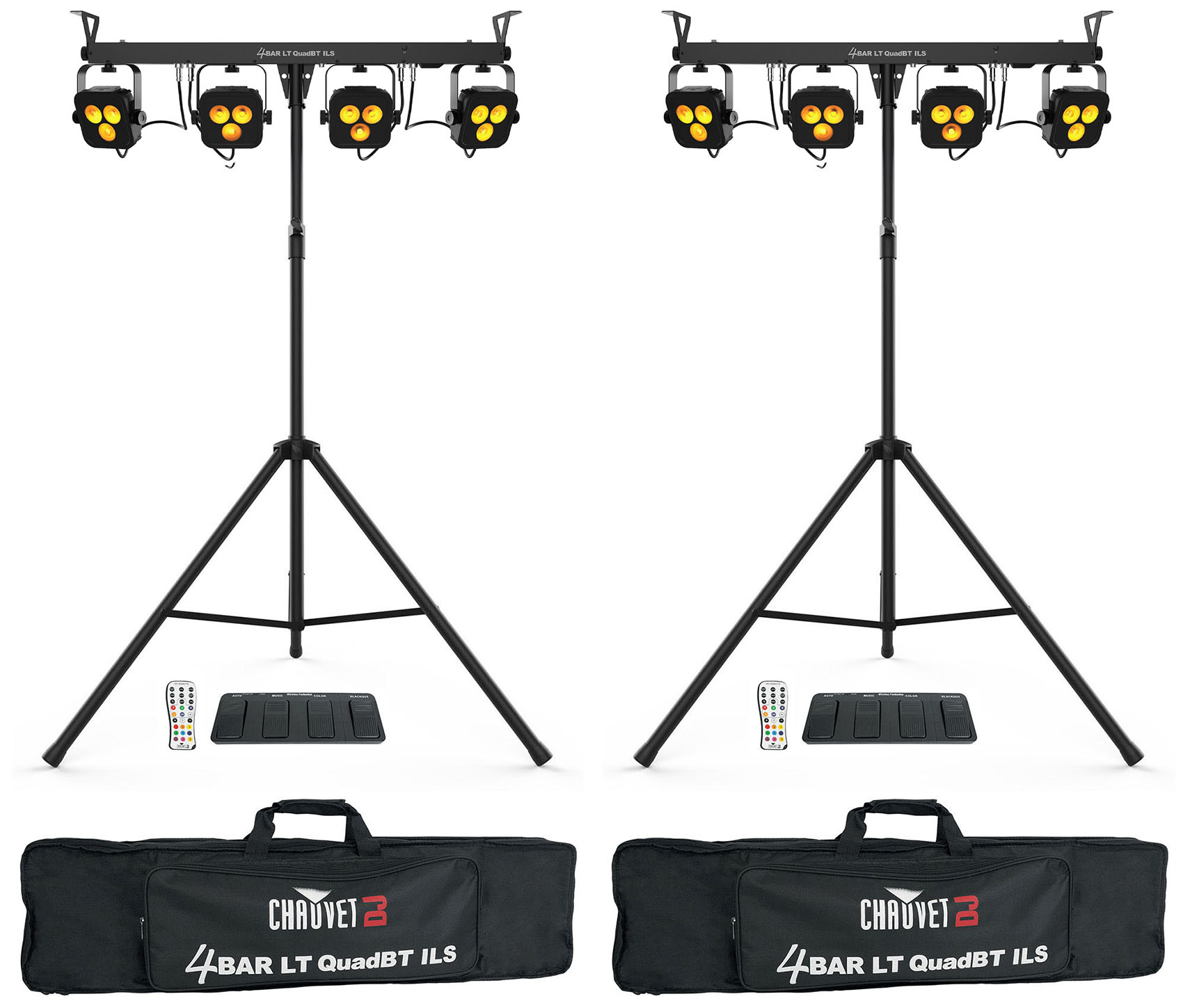 - (2) Chauvet DJ 4BAR LT QuadBT ILS Bluetooth Wash Lighting Kit+Tripod+Bags+Footswitch