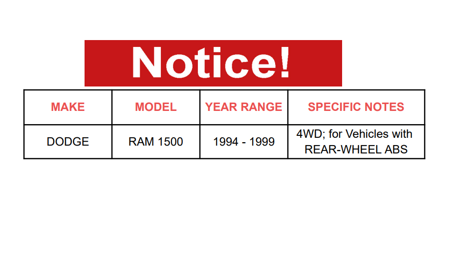 | DODGE | RAM 1500 | 1994 - 1999 | 4WD; for Vehicles with REAR-WHEEL ABS |