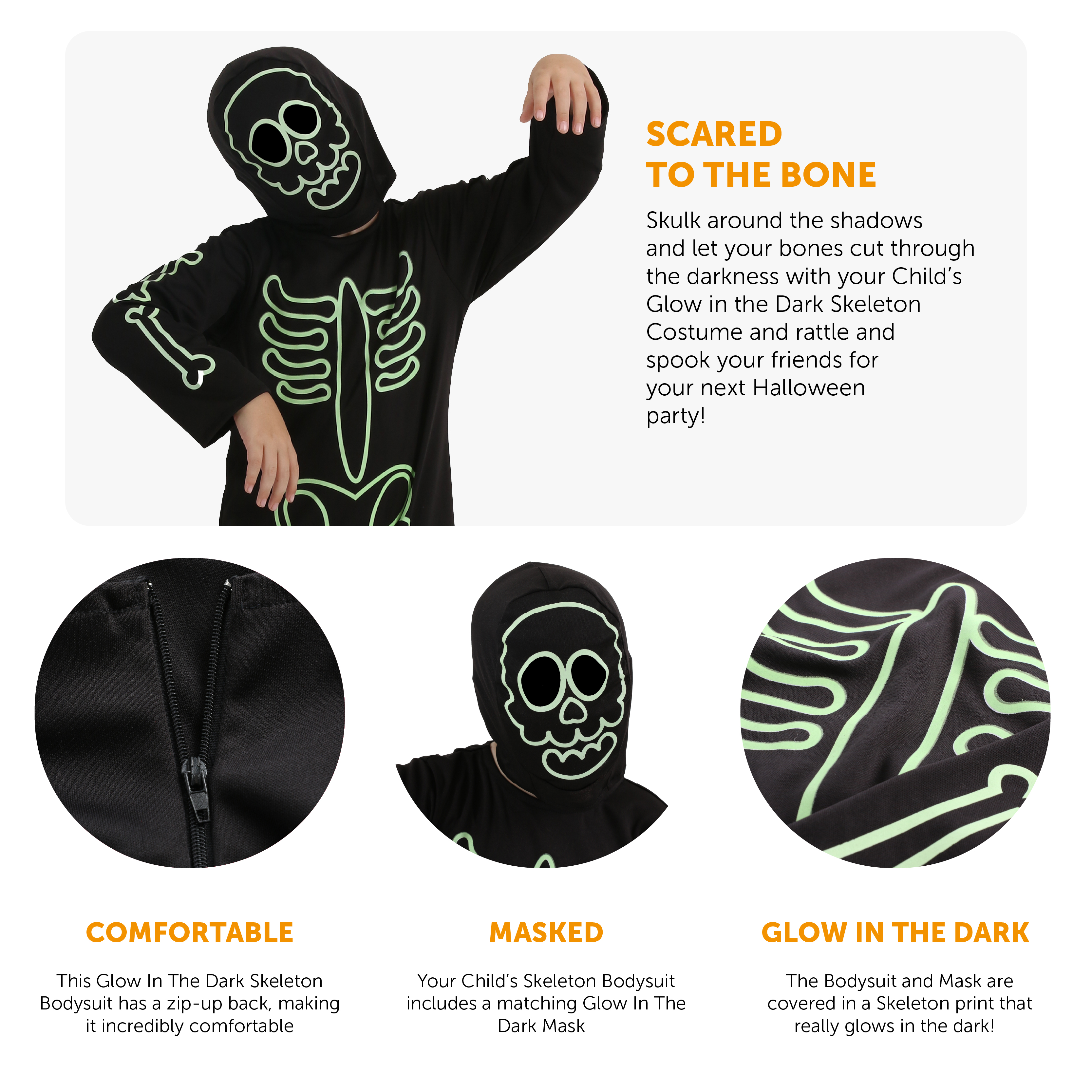 FANTASTIC COSTUME QUALITY: Your Childs Glow in the Dark Skeleton Costume is a comfortable costume to wear, being easily accessible to hop in and out of, and with a comfortable skull mask to see and breathe within