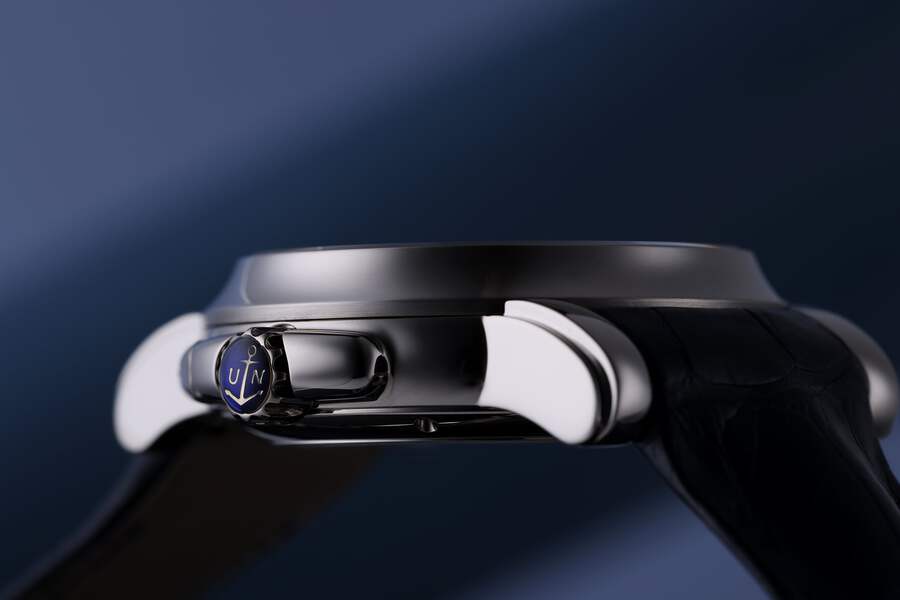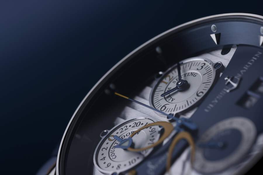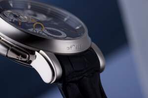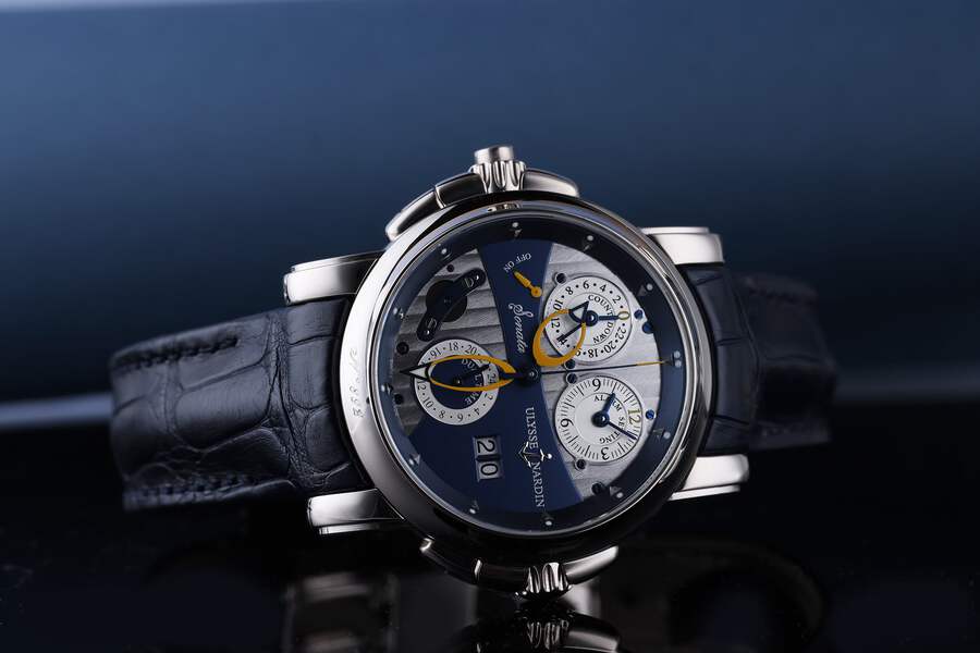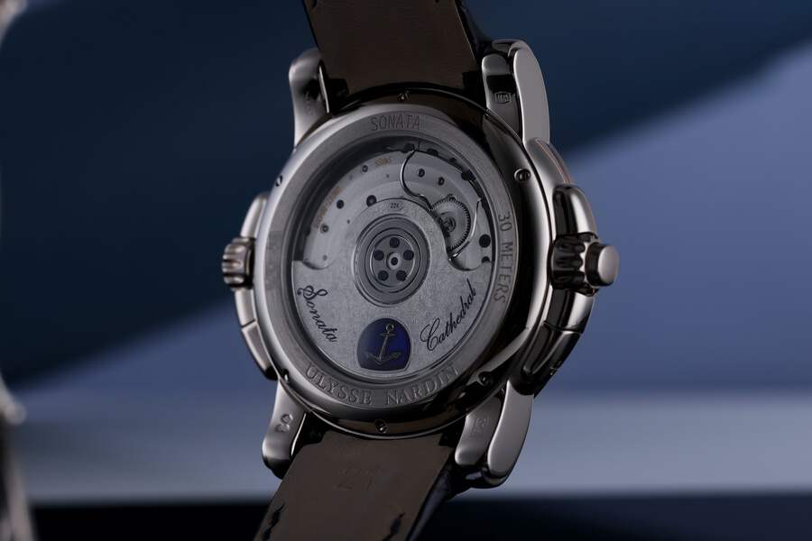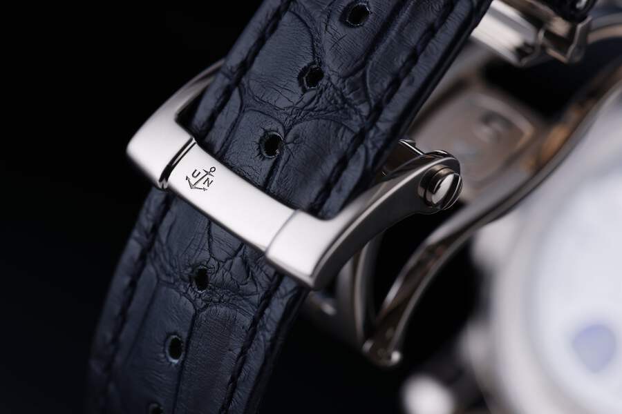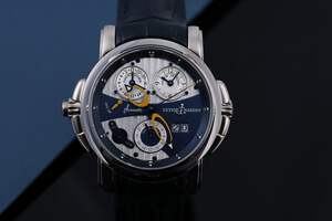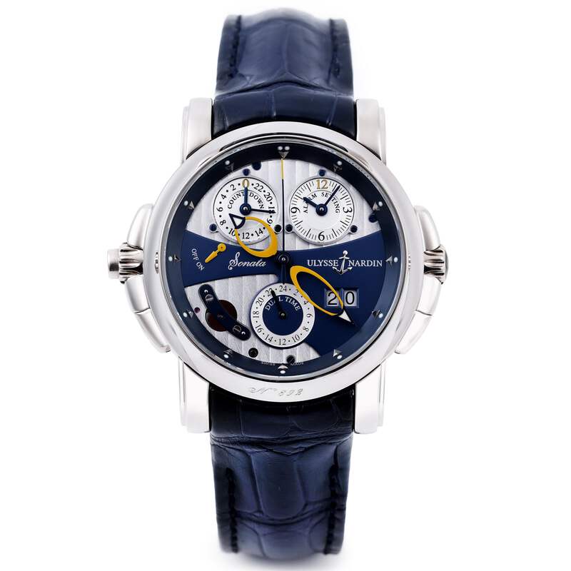Preowned, excellent condition Ulysse Nardin Sonata Cathedral Alarm reference 670-88/213 18k White Gold gents wristwatch. Silver and Blue dial, Yellow minute and hour hands, second time zone at 6 o'clock, double window date display, alarm function with countdown, a 41.5mm 18k White Gold case, fixed bezel, pushers and deployant clasp, a Ulysse Nardin navy blue leather strap, sapphire crystal glass, skeleton glass case back and automatic movement.