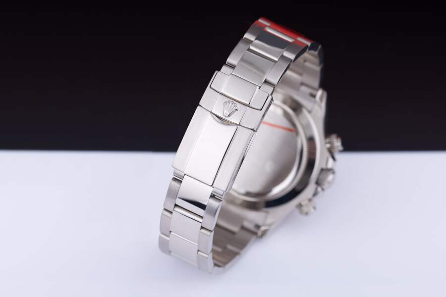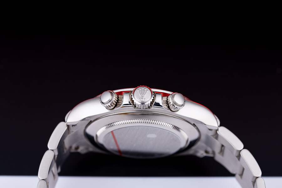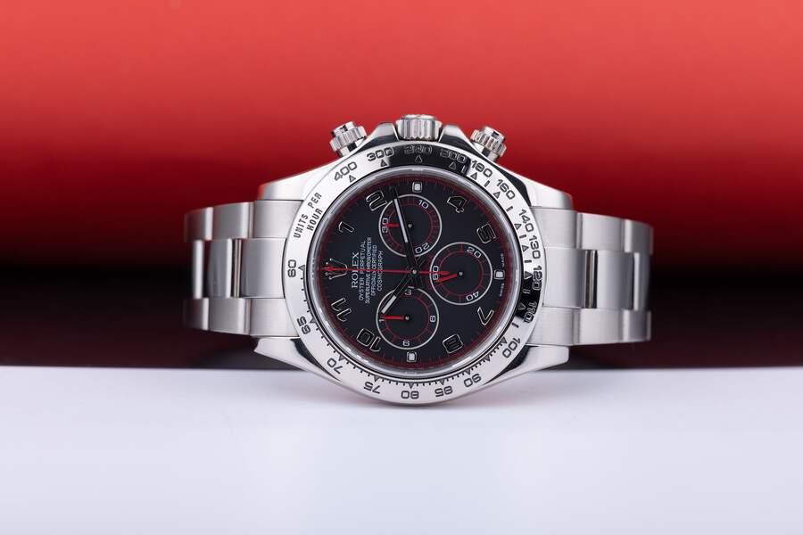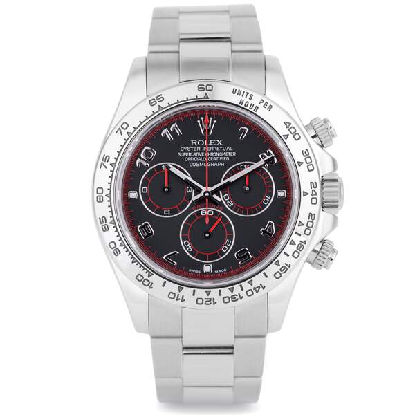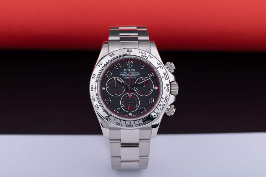 Pre-owned, excellent condition Rolex Daytona reference 116509 18k White Gold gents wristwatch. Black Racing Dial with red accents, three chronograph sub-dials, an 18k White Gold 40mm case, bezel, winder, pushers, Oyster bracelet and concealed deployant clasp, sapphire crystal glass, automatic movement and waterproof up to 100m. This watch has a serial: M07XXXX and was produced in 2007.