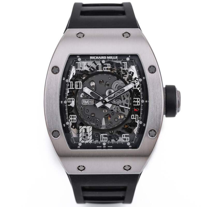 Pre-owned, excellent condition Richard Mille reference RM010 AG WG 18k White Gold gents wristwatch. Skeleton dial, date display at 7 o'clock, an 18k White Gold 40mm case, bezel and folding clasp, a Richard Mille black rubber strap, sapphire crystal glass and automatic movement.