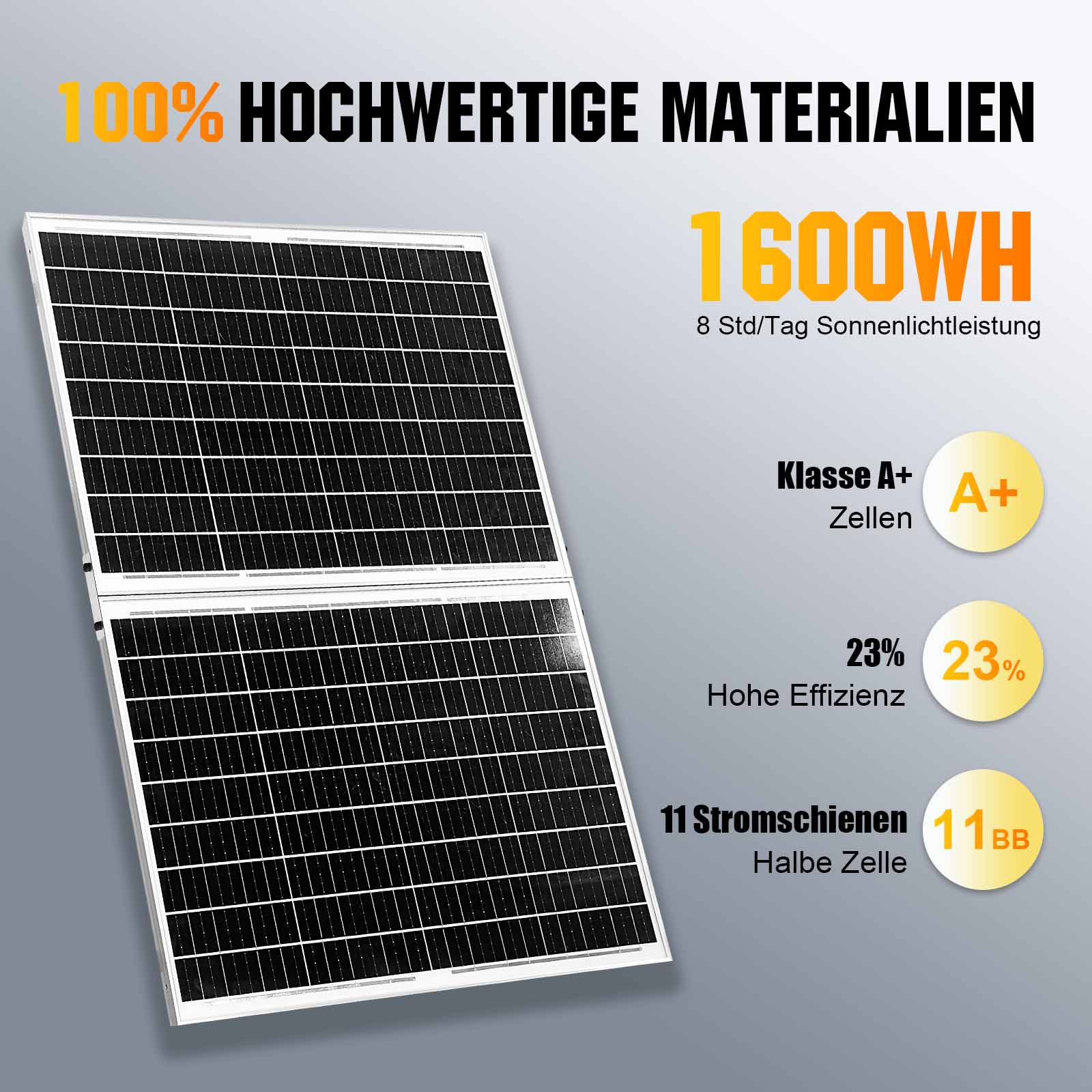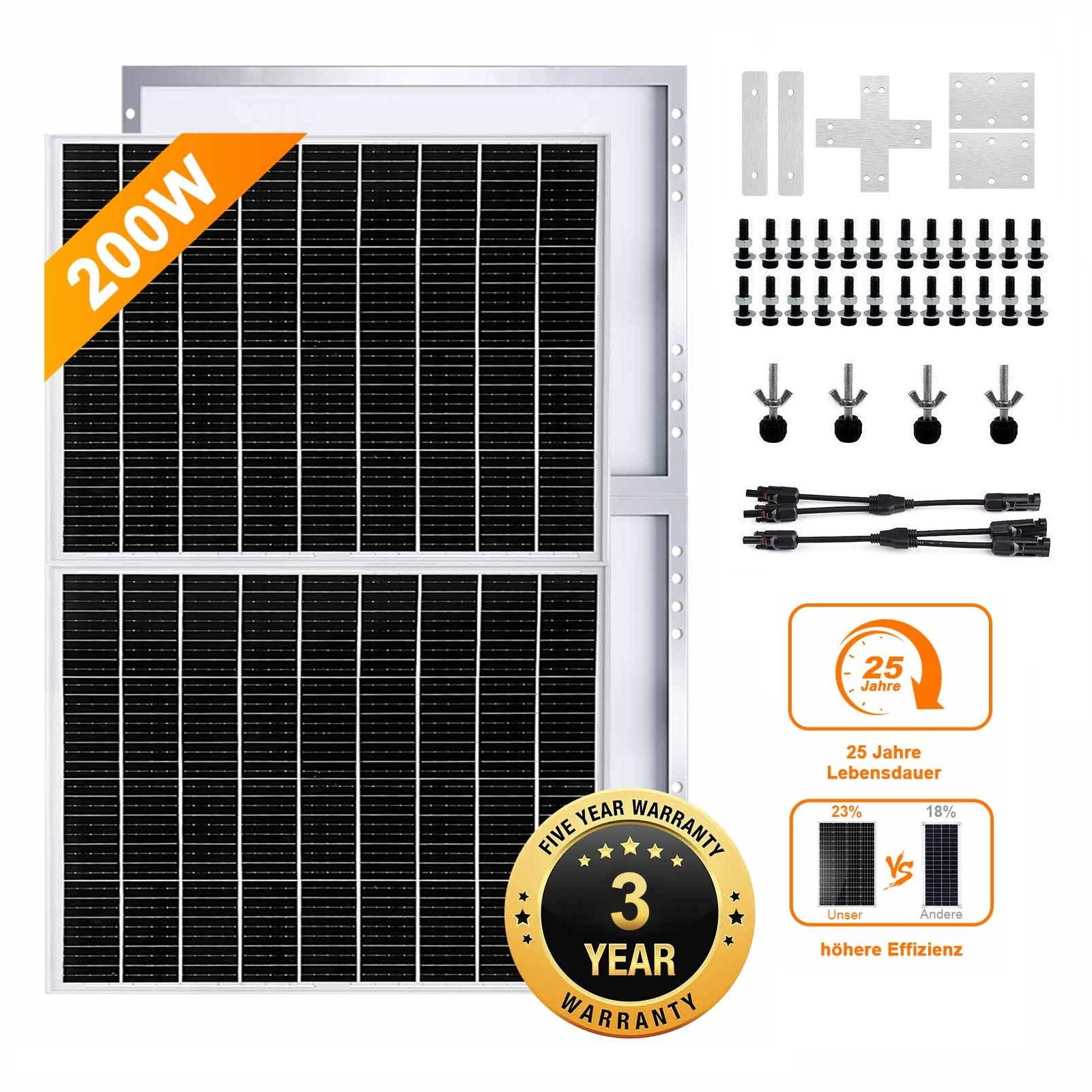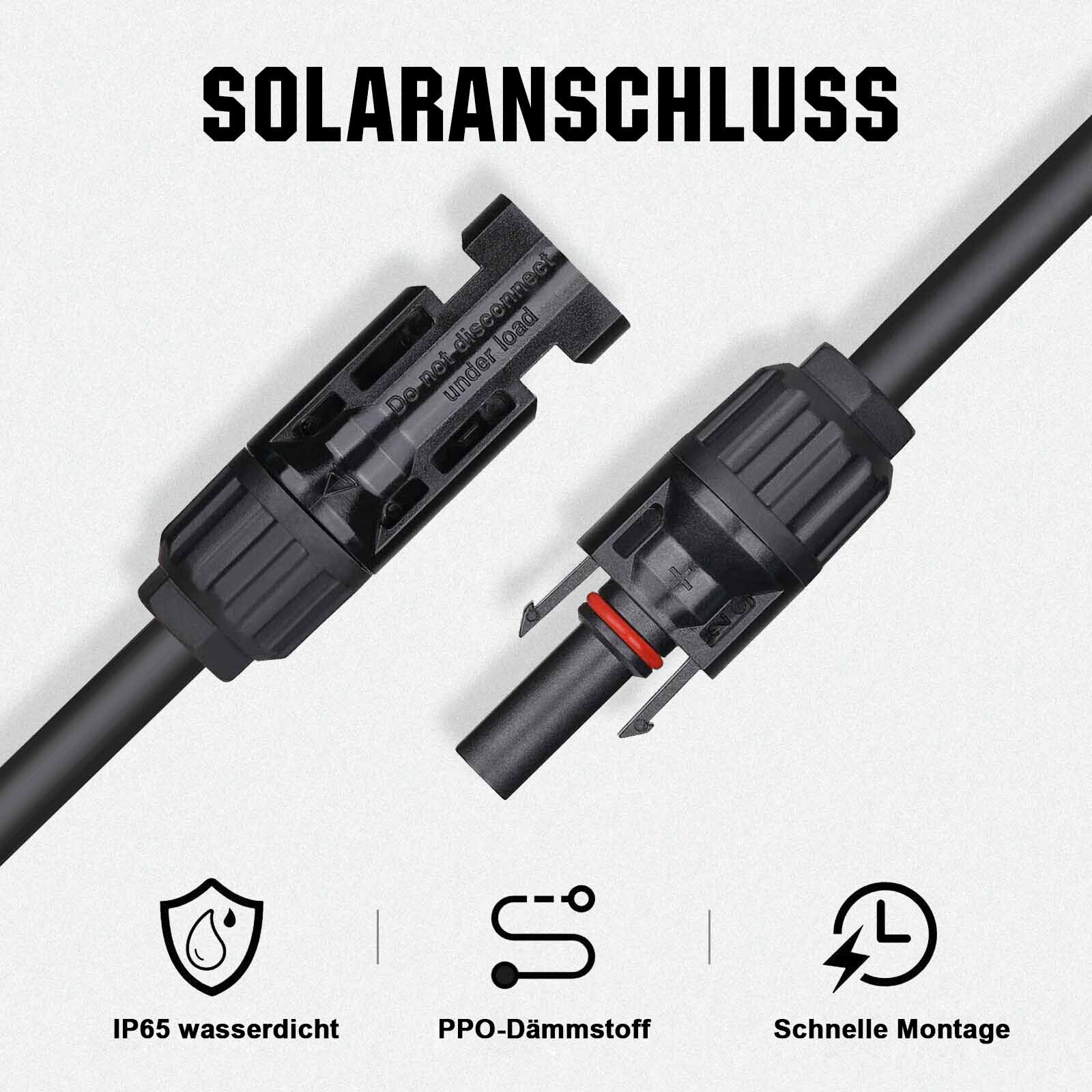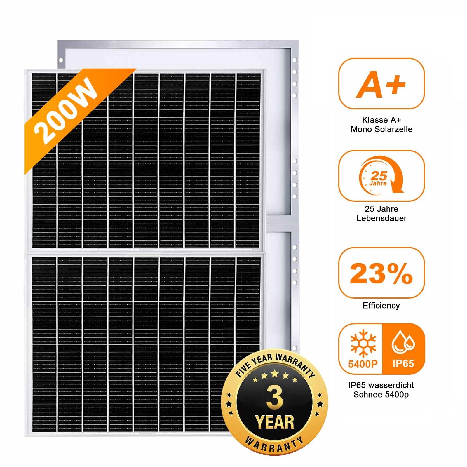 Es kommt mit vorgebohrten Montagelöchern, Solaranschlussleitungen und einer Anschlussdose. So können Sie ihn installieren, an einen Controller anschließen oder mit Panels erweitern, ohne ins Schwitzen zu kommen. Die Module bestehen aus monokristallinen Solarzellen der Premiumklasse A+, die effizienter sind als herkömmliche polykristalline Solarzellen.