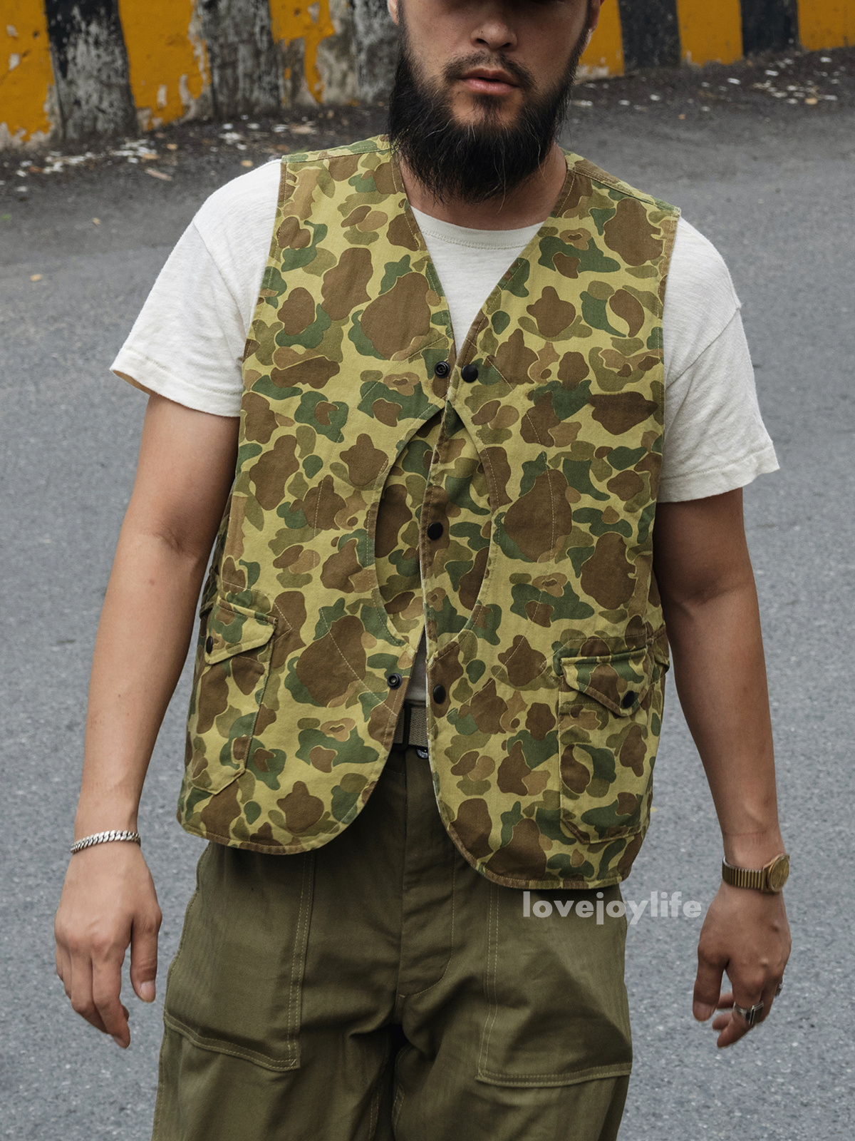 Frog skin camo is one of the earliest iterations of the military camo prints that we know today. Developed and tested in 1940 by the US Army Corps of Engineers, it features five colors and represents the first attempt at ‘disruptive coloration’, a type of camouflage that uses strongly contrasting shapes and patterns to break up the outlines of the wearer or vehicle. Frog skin was largely discontinued for American use after WWII, though it was also worn during guerilla warfare operations in Vietnam. Though frog skin camo saw limited use on the battlefield, its appearance in military surplus stores after WWII led to its popular use by hunters, which inspired imitations and revisions in hunting apparel designs. Frog skin was thus born into a second life as ‘duck hunter’ camo, which is used to create many hunting uniforms today.