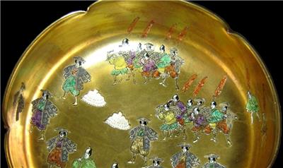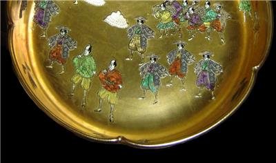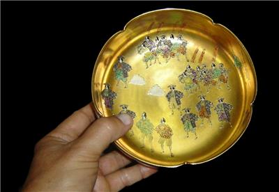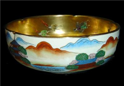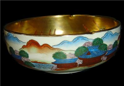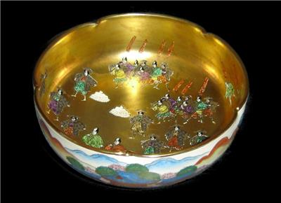 We are delighted to offering for your private collection this Fabulous!! and unusual Antique Japanese Satsuma porcelain Bowl,the bowl of scalloped edges having superb! heavy gold gilded interior and in top of the gold gilded many different hand painted Japanese figurines and Samurai.On the outside going around the bowl typical colorful Japanese landscape paintings.
