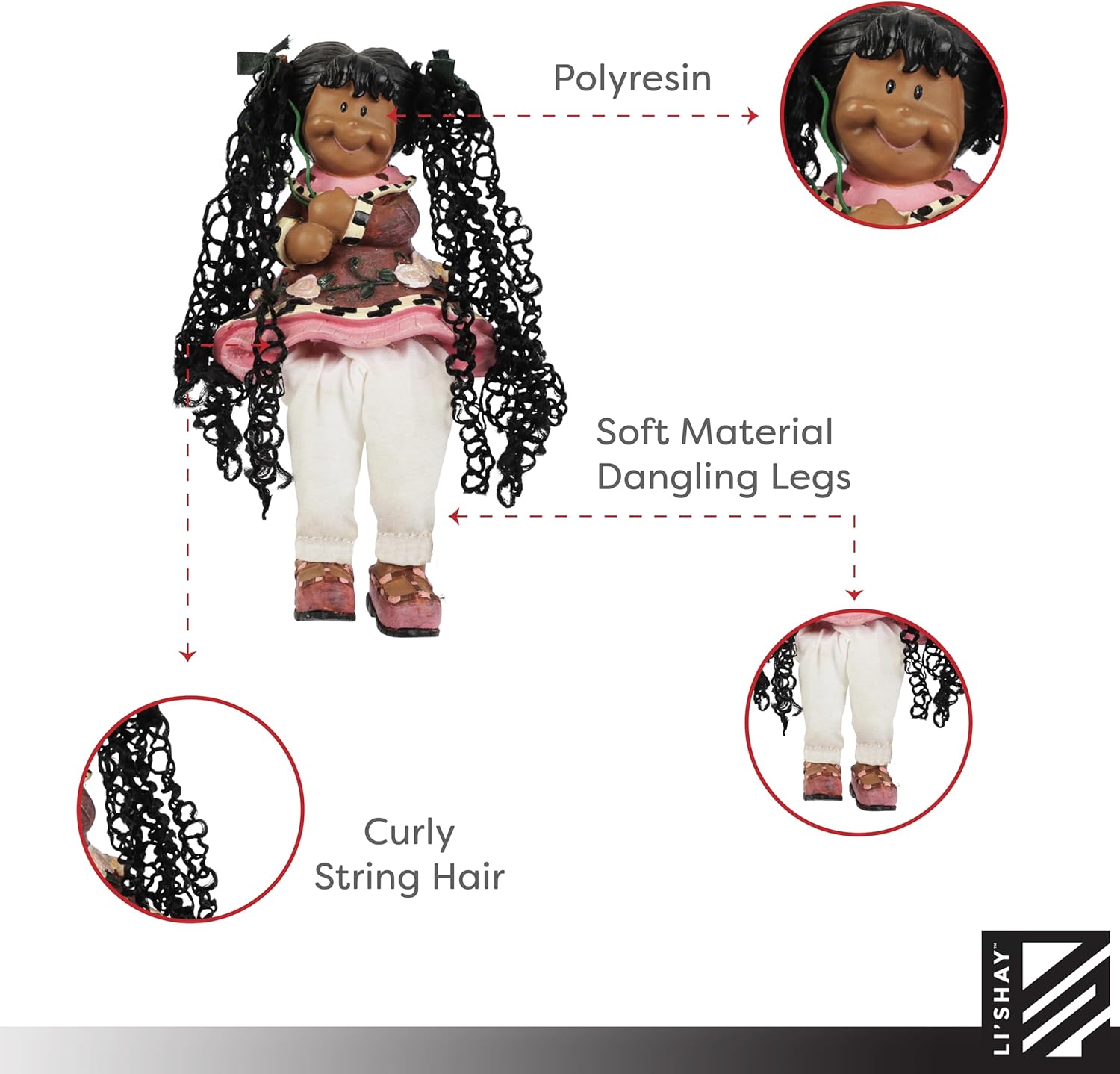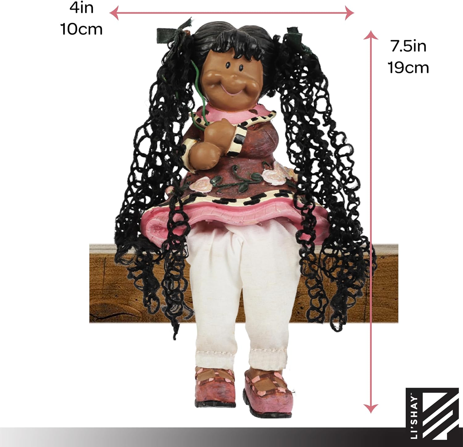 Our small shelf sitters has durable dangling legs are the made of hand-crafted resin and painted. This girl shelf sitter has a cute look with black stringy curly hair which makes the perfect home décor for childrens room or for any doll lovers. Gift it to a loved one or add it to your doll collections. These shelf sitters will add some fun to your room while dangling their legs in complete oblivion.