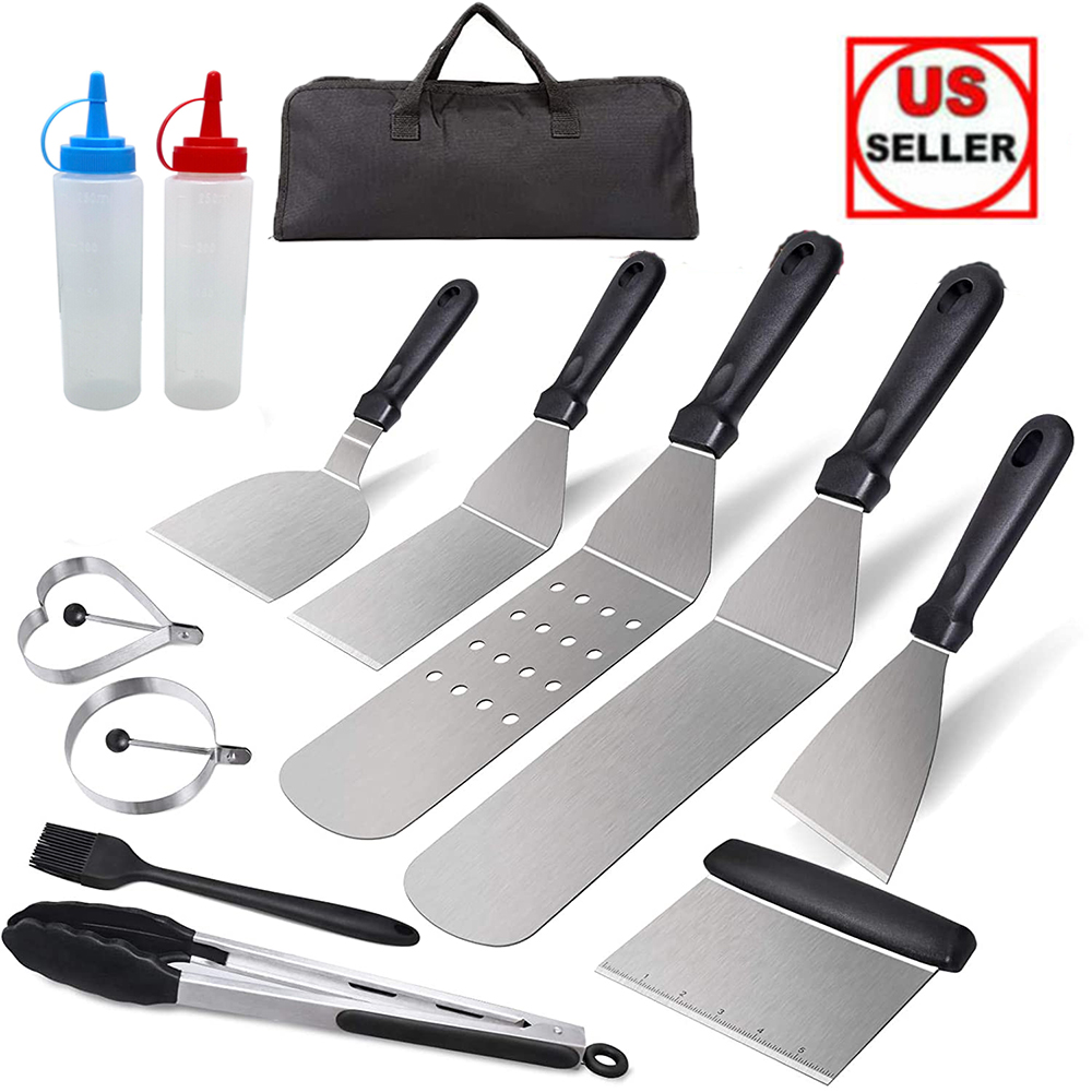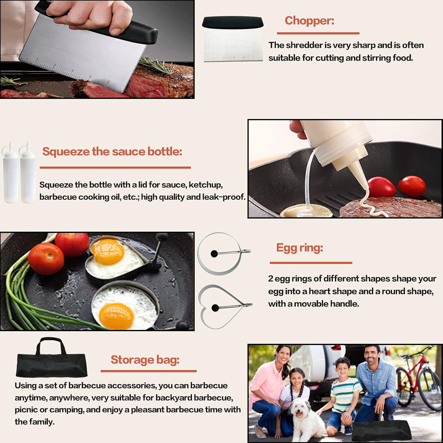2. 12 Pack BBQ Tools - 2 Long Griddle Spatulas,great for flipping beef cubes, fried egg, rice, noodle and vegetables. 1 Shorter Spatulas with 3-sided bevel cutting edge, great for turning burger, pancake and cutting bread, meat and sausage. 1 Griddle Scraper,1 Scraper Chopper,1 Stainless Steel Grill Tong,2 Bottles, 2 Egg Rings,1 Cleaning Brush,1 Korean Spatula.