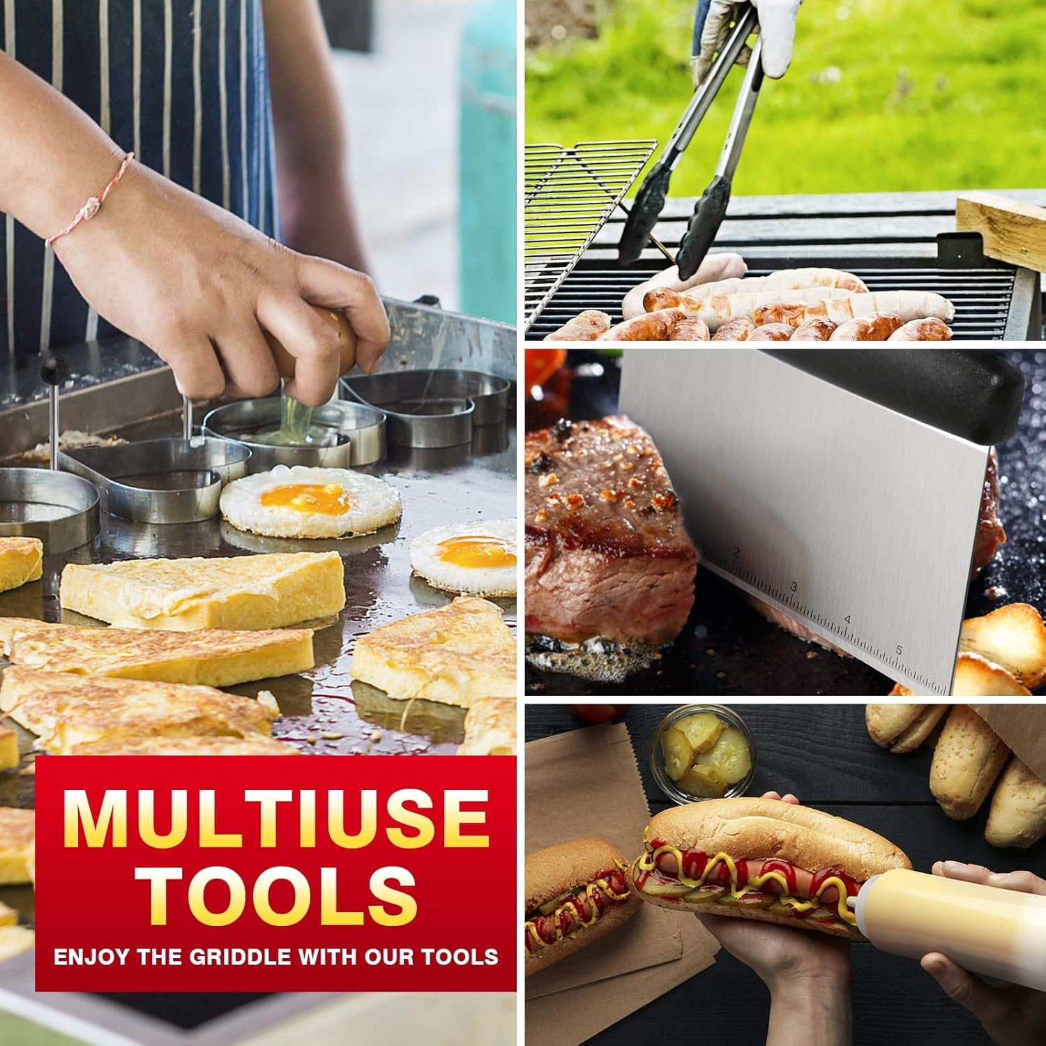 1. High-Quality Materials - our griddle accessories are made from commercial grade stainless steel with Ergonomic handle. durable plastic handle that resists heat and designed with hanging hole. heavy duty durable design and material bring significant long term value.