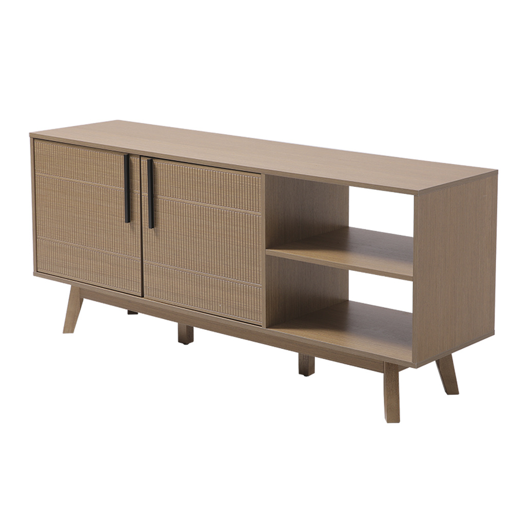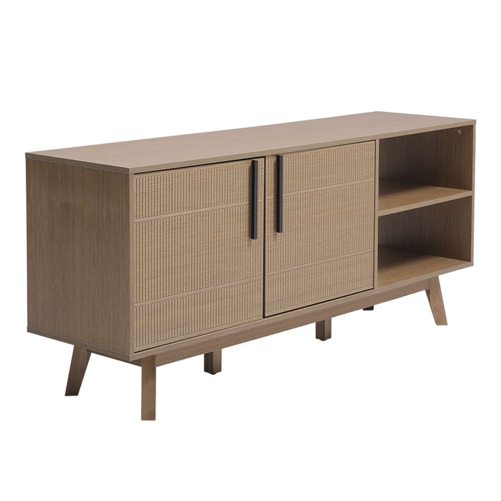 Slatted pattern doors contrast with wood legs in an on-trend fusion of sleek lines and rustic detailing.