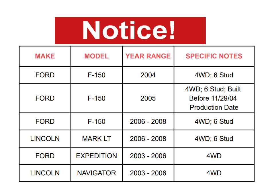 | FORD | F-150 | 2005 | 4WD; 6 Stud; Built Before 11/29/04 Production Date |