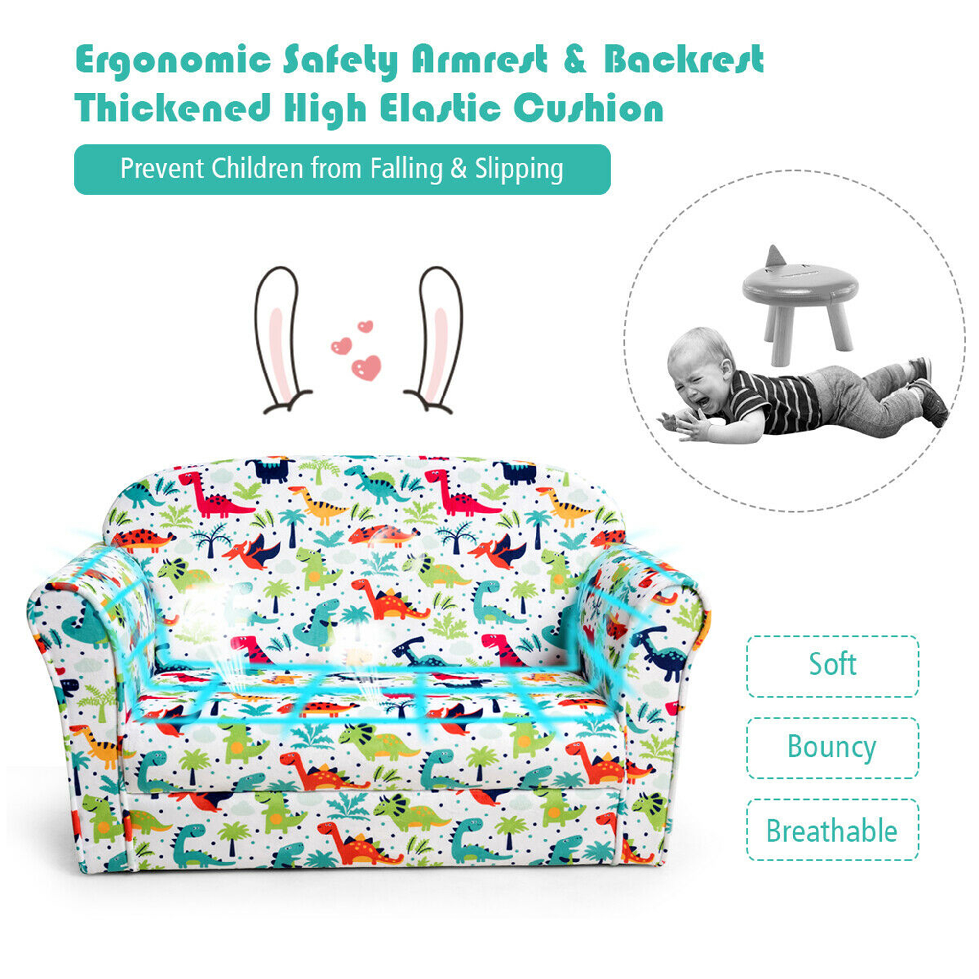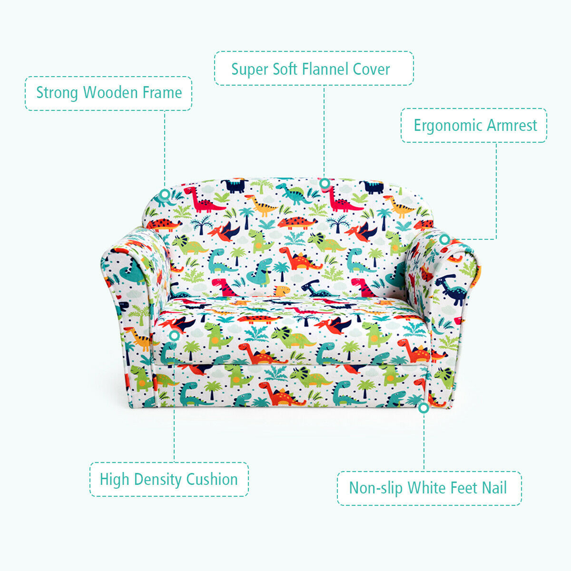 With this lovely sofa, kids will be more likely to settle down and start to learn or just read. Our double kids sofa is great for entertainment and leisure, your kids can sit or lounge on the sofa to watch TV or read books in complete comfort. Covered with super soft velvet surface and supported by steady wooden frame, our sofa creates a cozy and safe world for your children. Weigh only 12.5lbs, this child sized sofa with lovely dinosaur pattern is suitable for any place, no matter outdoors or indoors. A perfect present idea for children!