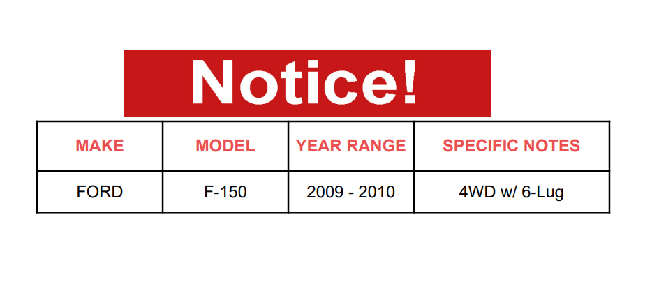 | FORD | F-150 | 2009 - 2010 | 4WD w/ 6-Lug |