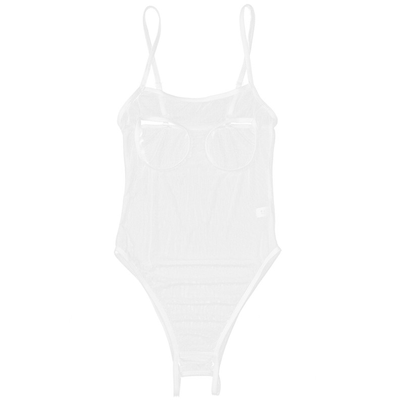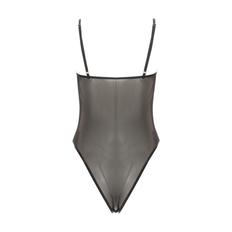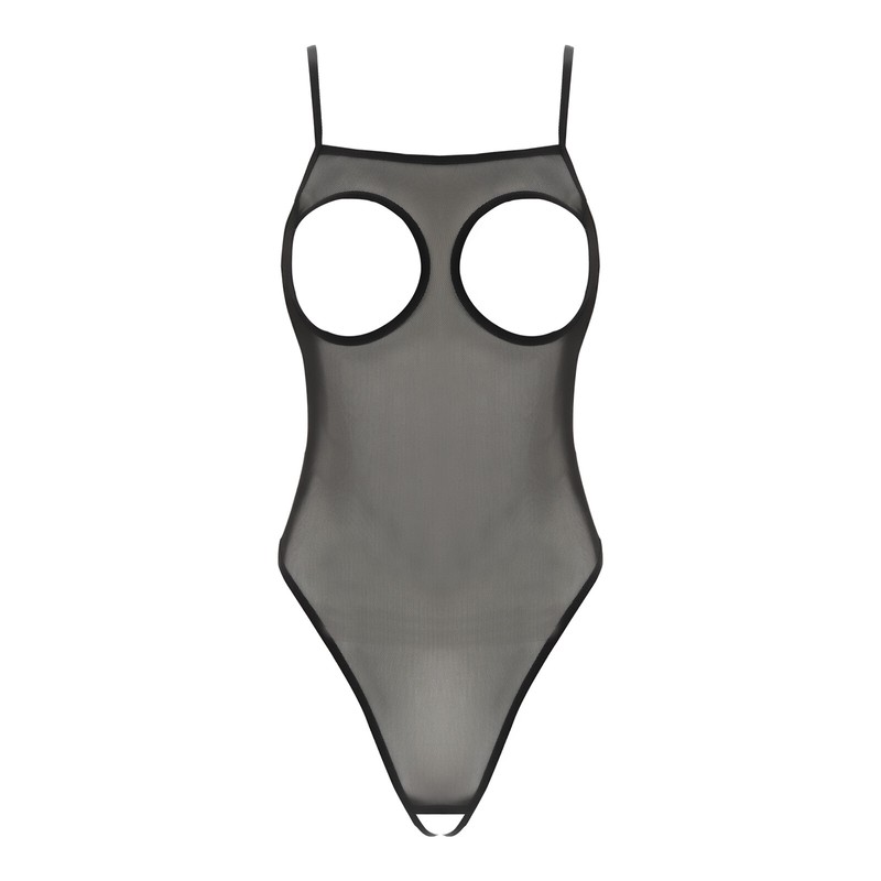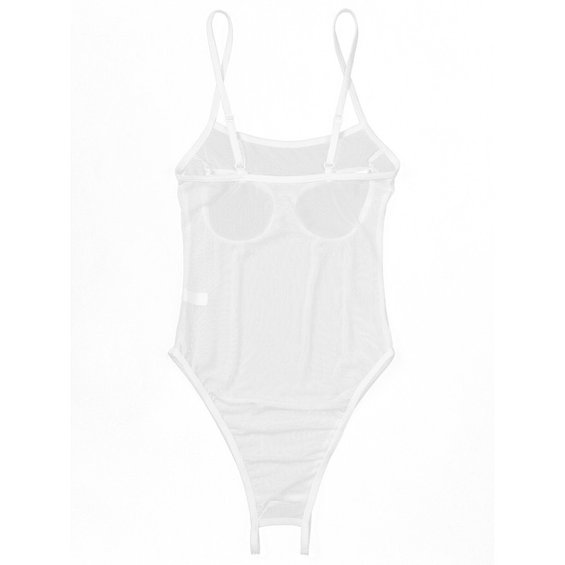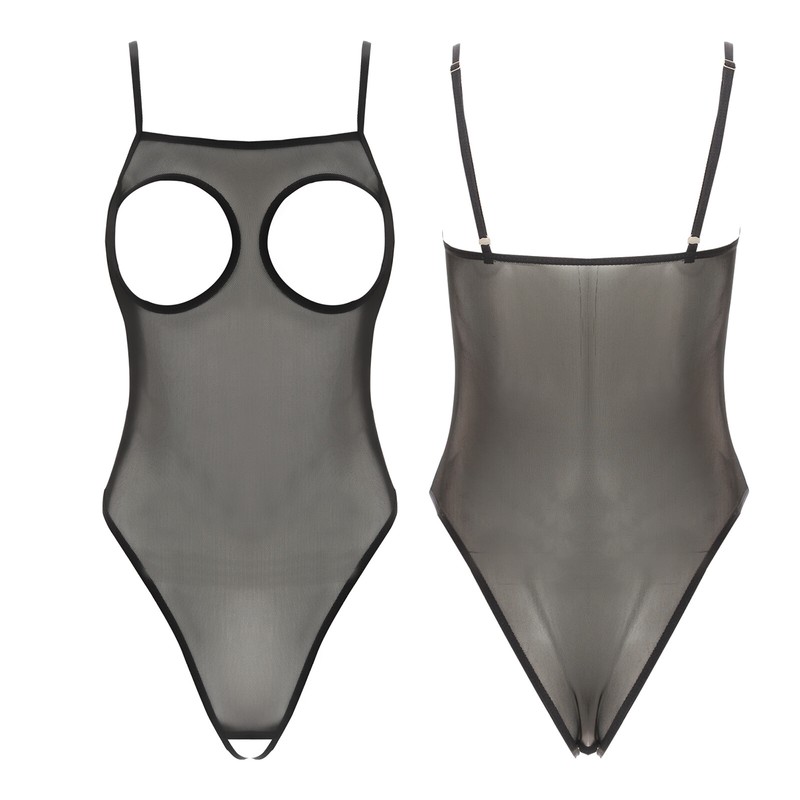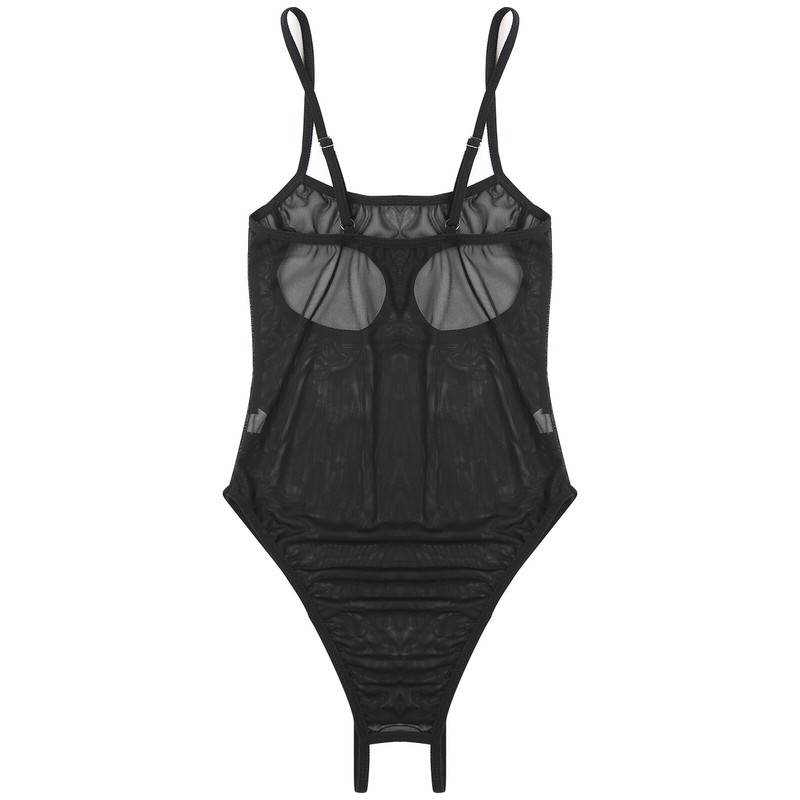 See-through sheer mesh design with adjustable spaghetti shoulder straps, breast hollow out, backless and crotchless, high cut legs.