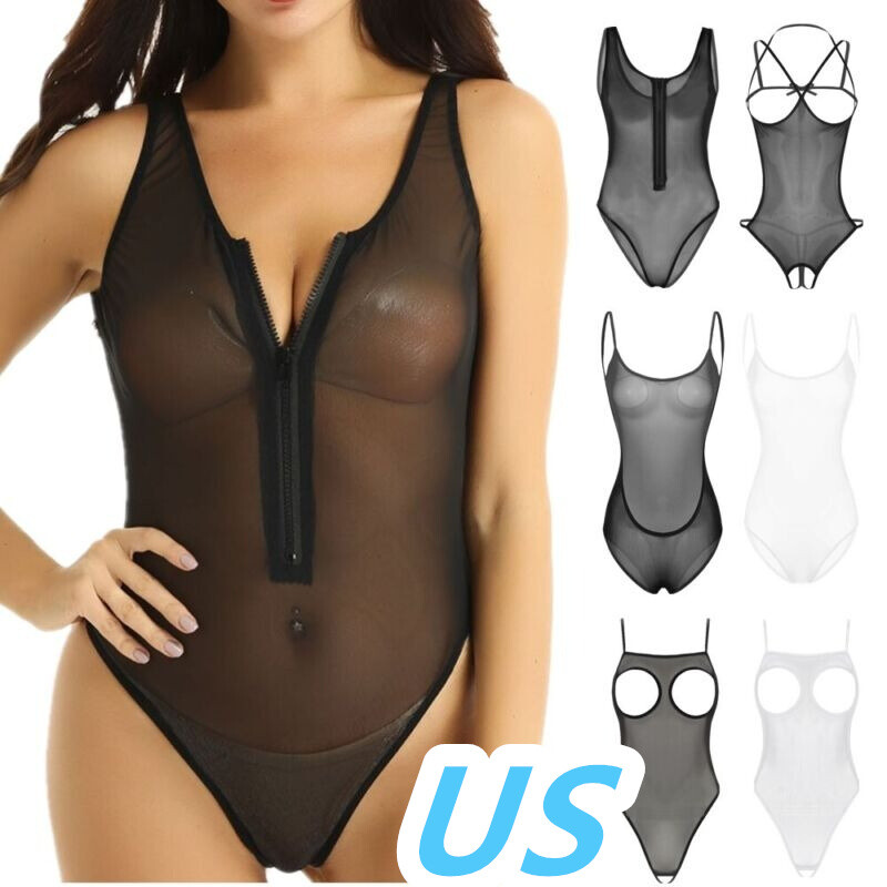 Sleeveless, deep u neck and back with a zipper in the front, see through sheer mesh design, high cut legs.