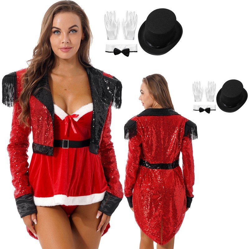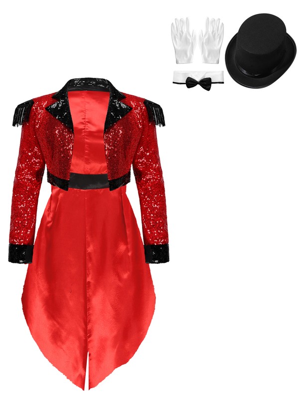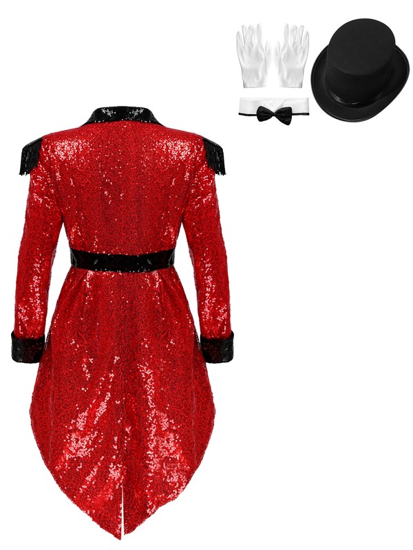 Circus tailcoat has sparkly sequins all over; designs with long sleeve, color block, open front, fringed epaulettes and smooth lining.