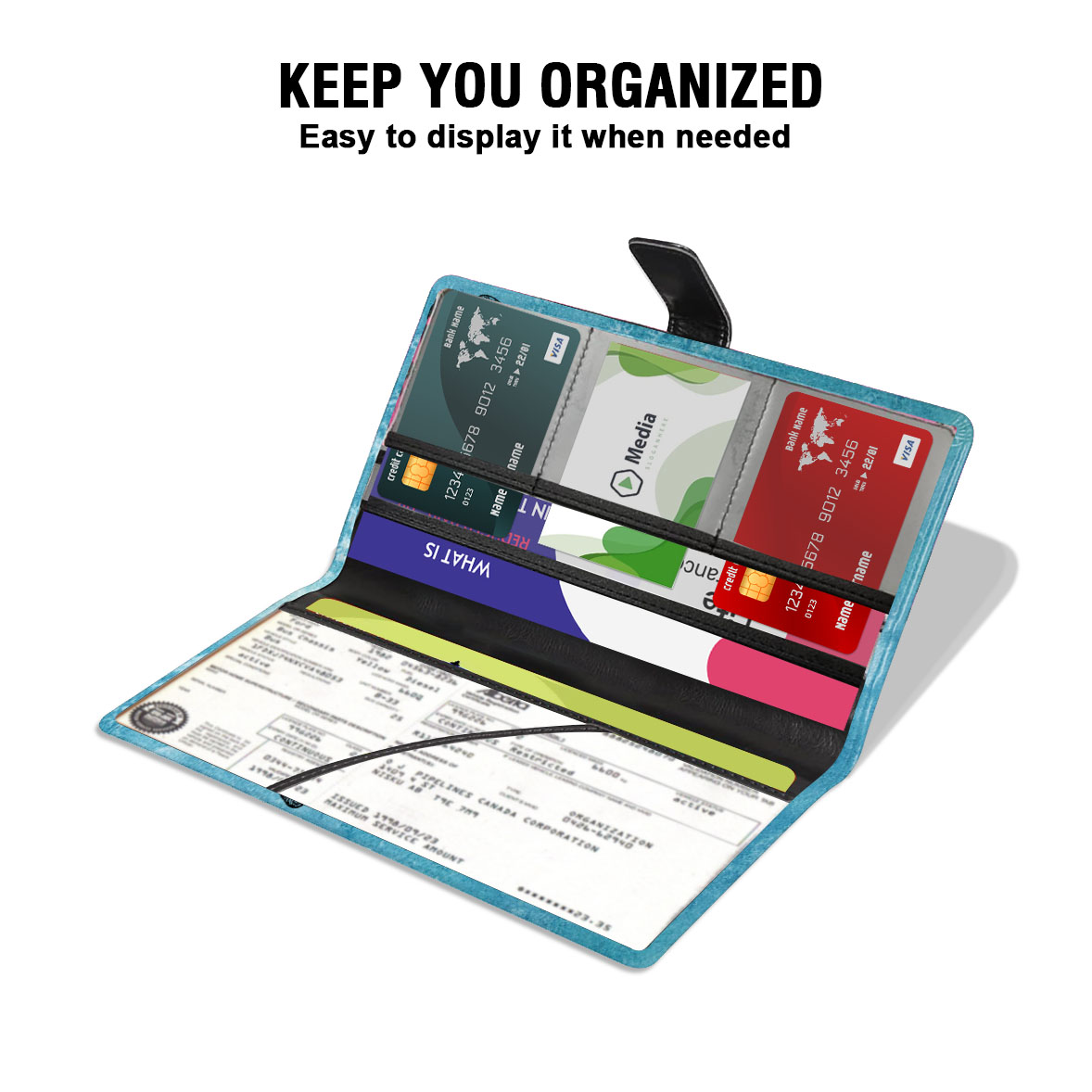 • This nice roomy document holder includes one large pocket for your important documents like car insurance, two pockets to contain vehicle registration cards and 3 smaller pockets that can fit a driver's license or other valuable cards.