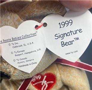 Up for purchase is a Ty Beanie Baby ~ 1999 Signature Bear ~ Mint With Mint Tags. You wouldn’t think this simple little thing would cost so much just from the first glance. But it’s the classic teddy bear look and the adorable, stitched heart detail that make it a moneymaker. Release date: 1/1/99; Retirement date: 12/23/99; Poem: According to Beanie Babies Price Guide database, 1999 Signature Bear didn't get a poem/ This is a 1999 Signature Bear, Rare, In excellent condition Authentic Ty Beanie Baby with Errors in the Hang tag, This 1999 TY Beanie Baby, named "1999 SIGNATURE BEAR", is a retired collectible that is highly sought after by enthusiasts. It features rare tag errors that make it even more unique and valuable. The bear is part of the Beanie Babies Original collection and belongs to the Ty brand, known for their high-quality plush toys. The recommended age range for this item is 1+ and it belongs to the Beanbag Plush category under Toys & Hobbies. The character family is Beanie Babies, and the bear comes with a set of aspects, including the brand Ty and the year 1999. This is a must-have item for any serious Beanie Baby collector or fan. Tag Error: "GASPORT", should be "GOSPORT".