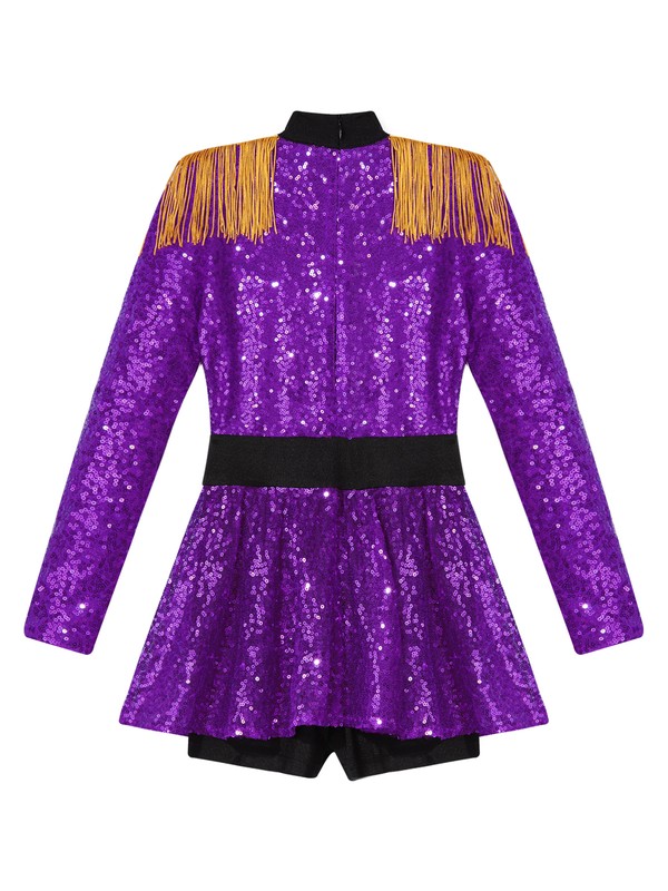 Shiny sequins circus costume for girls, long sleeve short dress with tassel epaulet.