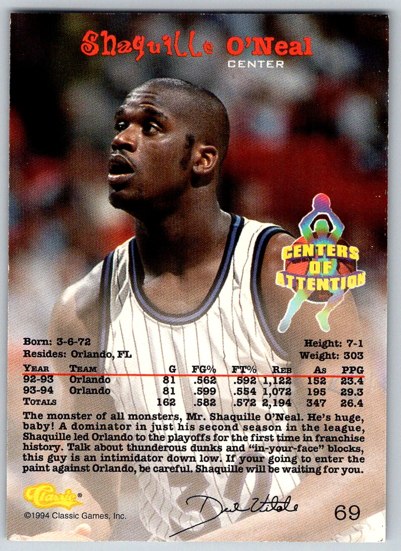 | 1994-95 Classic Draft SHAQUILLE O'NEAL #69 Magic Centers of Attention HOF | ||||||||||||||||||