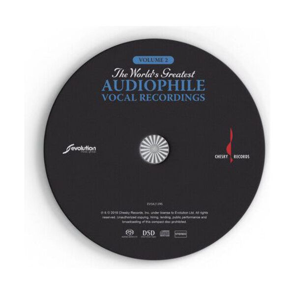 Available for the first time ever on vinyl and SACD, Chesky's "The World's Greatest Audiophile Vocal Recordings Volume 2" is a collection of the very best vocalists within the audiophile scene. This esmerizing collection of songs has been hand-picked for the very best listening experience. Featuring the signature vocals of audiophile sirens Ana Caram ("Fly Me To The Moon") and Valerie Joyce ("That's What Friends Are For") and the soulfully smooth stylings of Macy Gray ("First Time") and Christy Baron ("Spooky") and more. The album showcases the vocal dynamics of this formidable roster in a natural recording that makes it feel like they are right in the room with you. The album attests to Chesky's commitment to detailed, clear, high-quality sound and perfectly introduces the label's unique approach to record production. "The World's Greatest Audiophile Vocal Recordings Volume 2" will be available on 180g Vinyl LP (audiophile pressing) and SACD Hybrid Stereo by Evolution Music Group.