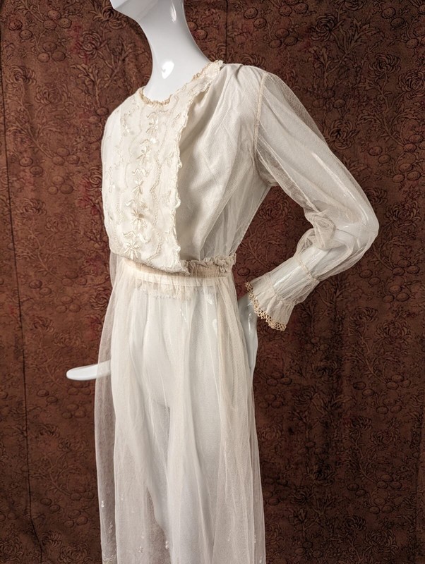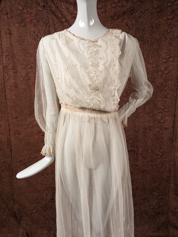 FASHIONED OF A SOFT COTTON NET WITH SILK FLOSS EMBROIDERY ALL ALONG THE FRONT AND MATCHING EMBROIDERY ALL ALONG THE BOTTOM HEM.
