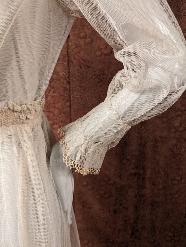 OFF WHITE TATTED LACE TRIMS THE FRONT COLLAR WITH MATCHING LACE TRIMMING THE CUFFS OF THE RUCHED SLEEVES.