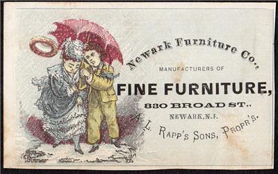 Item: Vintage 1880's - 1890's era Victorian trade card advertising the Newark Furniture Co. - Manufacturers of Fine Furniture - 830 Broad St. - Newark, N.J. - A. L. Rapp's Sons, Propr's.