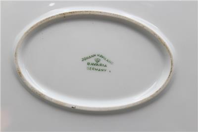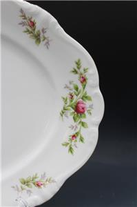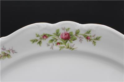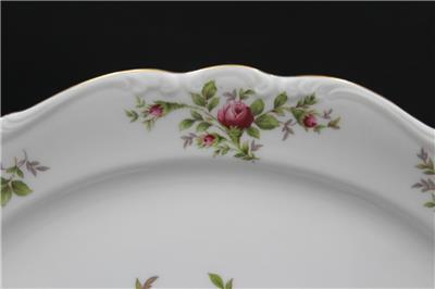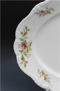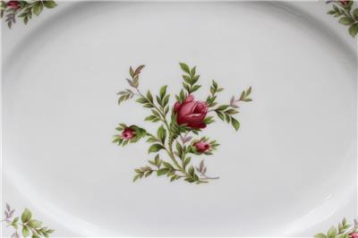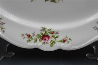 This listing is for a set of 2 vintage German porcelain oval serving platters by Johann Haviland in the Moss Rose pattern. The platters have a scalloped edge with a white ground and large sprays of red roses and lush green foliage. They are further accented with a heavy applied gold rim on the edges. They are marked on verso "JOHANN HAVILAND BAVARIA GERMANY". The larger platter measures 11 by 15 inches, the smaller platter is 9 3/4 by 13 inches.
