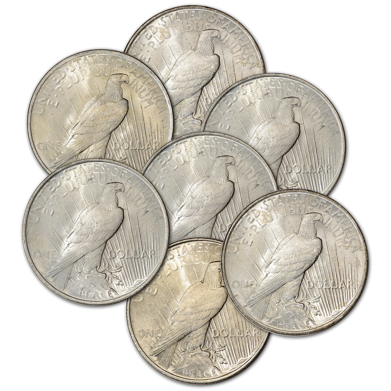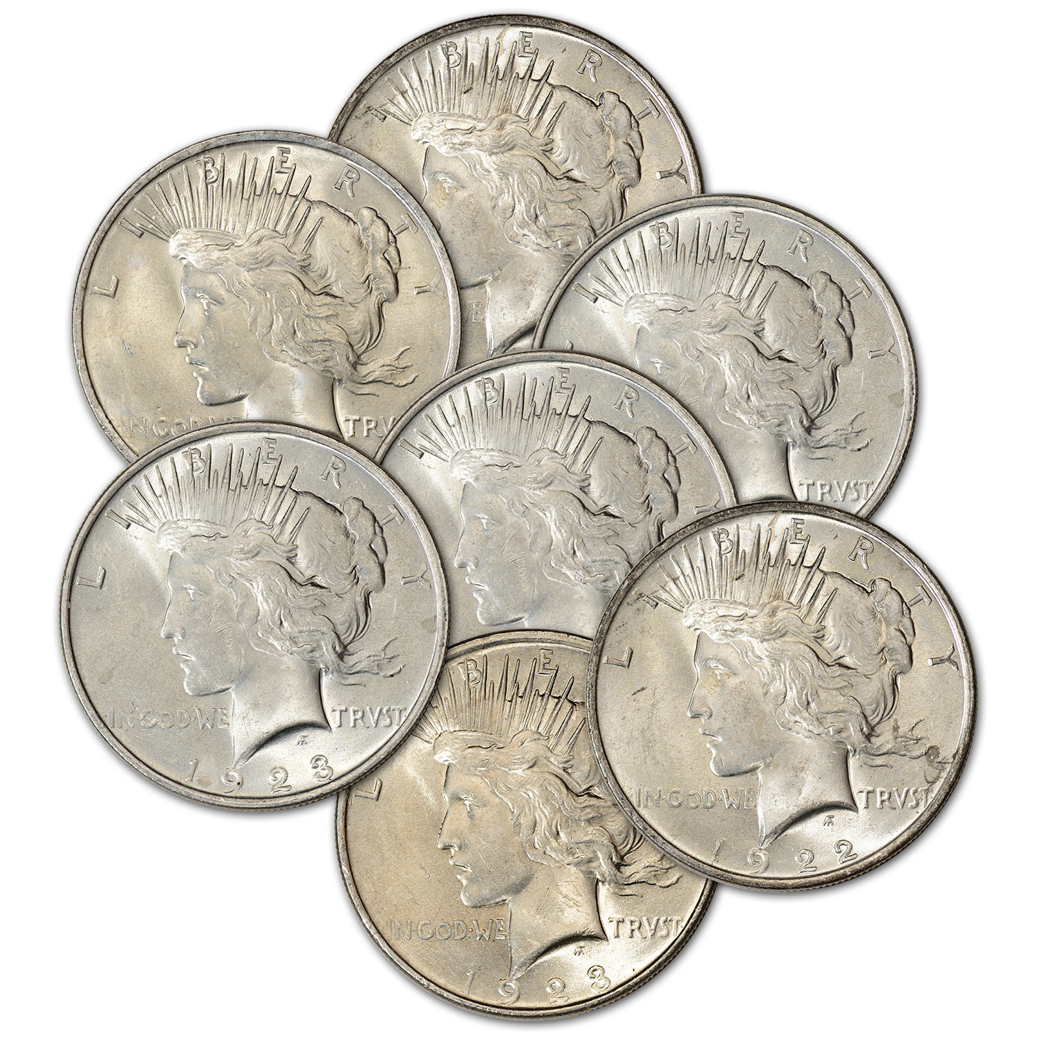 Peace Silver Dollars were introduced in 1921 as the successor to the popular Morgan Silver Dollar series. Peace Silver Dollars are dated 1921 to 1935 and minted in 90% silver and contain .7734 ounces of silver. The coin was designed by Anthony de Francisci.