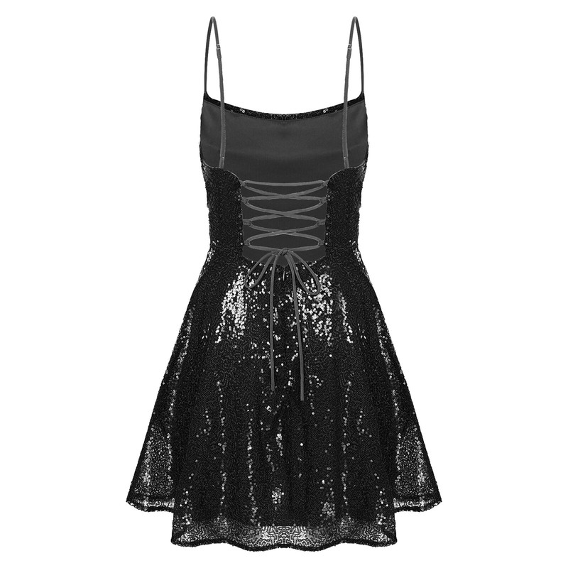 Womens Glittery Sequin Lace-up Back Cocktail Dress Spaghetti Straps Mini Dresses