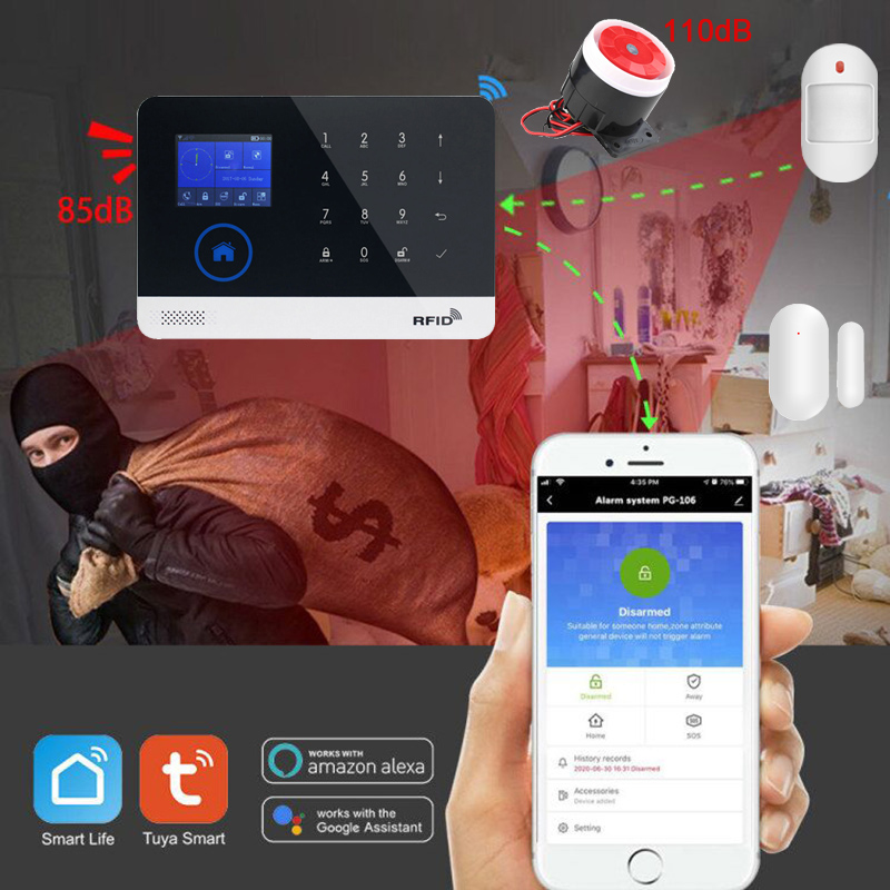 A: Compatible with Alexa and Google home: This alarm sysetm works with Amazon Alexa and Google Home for voice control ( Alexa and google home devices not included ). Just ask app Alexa on your phone to Arm / Disarm/ the whole system in a specific instruction like "Alexa, please arm the alarm system". Remote control your Alarm system anywhere in the world with your smart cell phone, no need repeated operation!