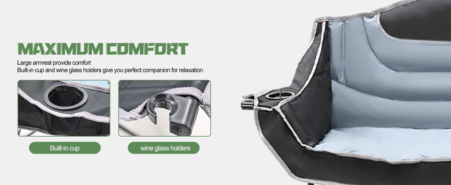 ๐ใOversized & Ultimate ComfortใHigh-density foam padding ensures exceptional comfort and back support. The fully cushioned seat provides a delightful seating experience. Featured with the oversized design, the camping chair provides more space and comfort.