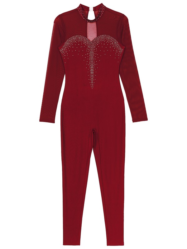 Full length figure skating jumpsuit ensures total movement and flexibility when leaping, dancing or tumbling.