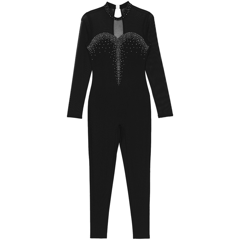 This figure skating jumpsuit with sheer mesh patchwork design and rhinestones makes you stand out from the crowd.