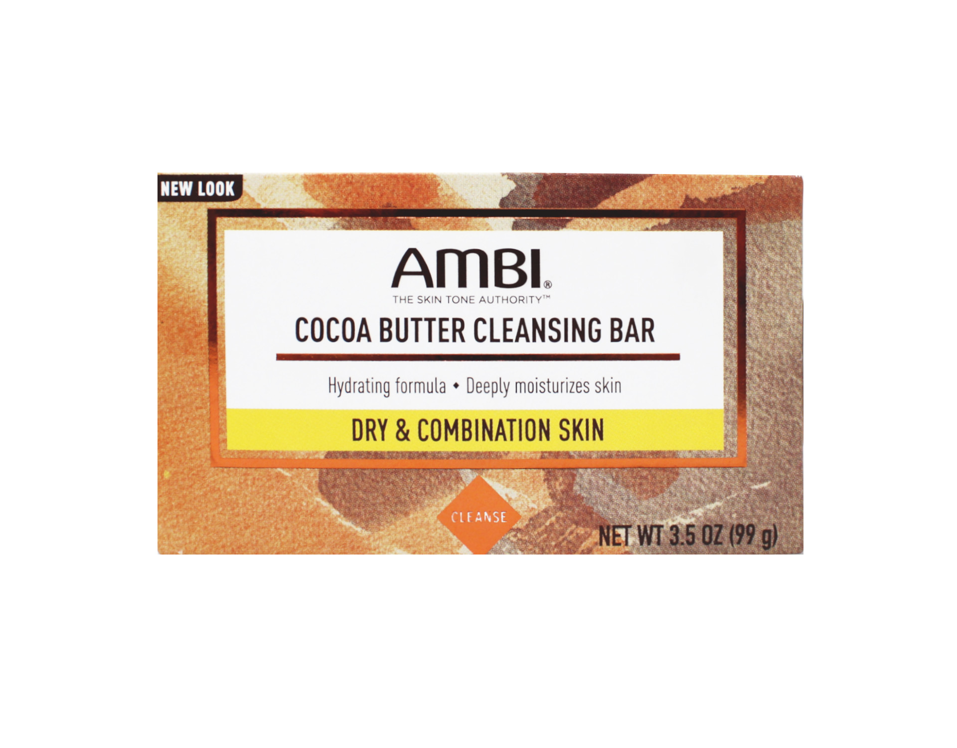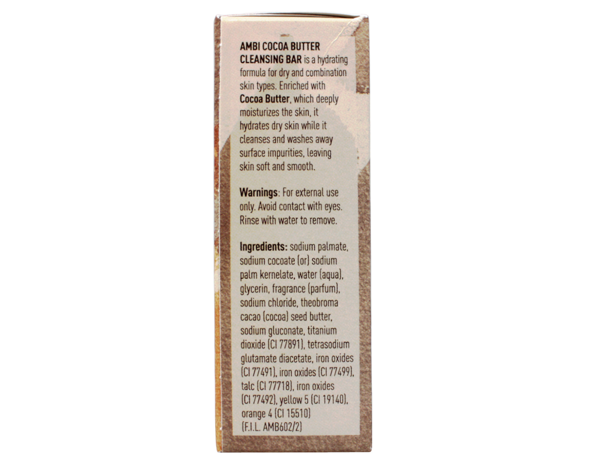 AMBI® Cocoa Butter Cleansing Bar gently moisturizes and softens dry skin. It contains Cocoa Butter which deeply moisturizes the skin. This hydrating formula also nourishes the skin, leaving it soft and smooth. Its creamy, rich lather gently and effectively washes away surface impurities to reveal clean, smooth, and even toned skin. How to Use: Wet face, lather soap and massage onto skin. Rinse well and pat face dry. Warnings: For external use only. Avoid contact with eyes. Rinse with warm water to remove. Naturally moisturize Helps even out skin tone Creamy rich lather Washes away surface impurities Reveals clean, smooth, and even looking skin