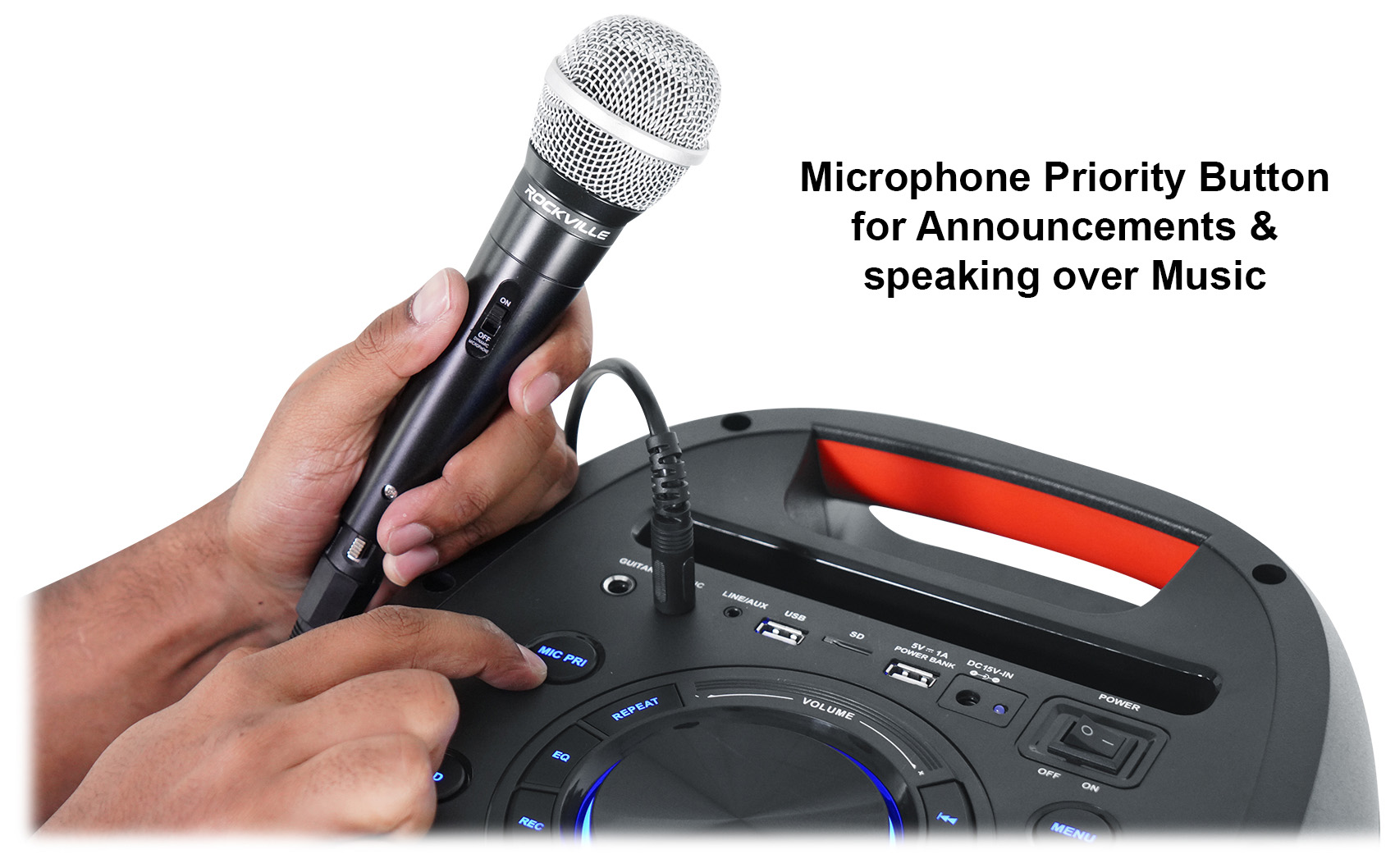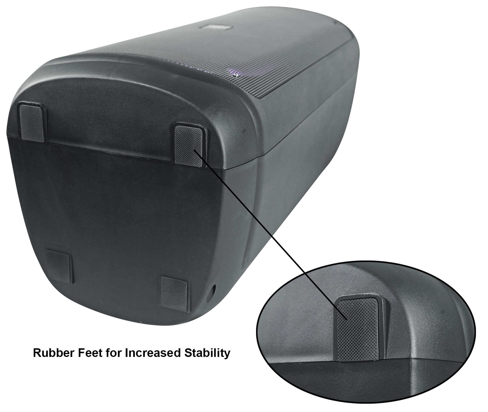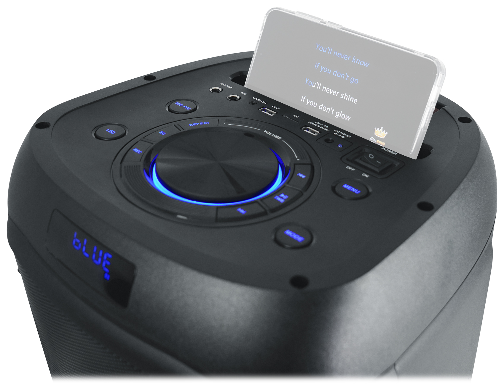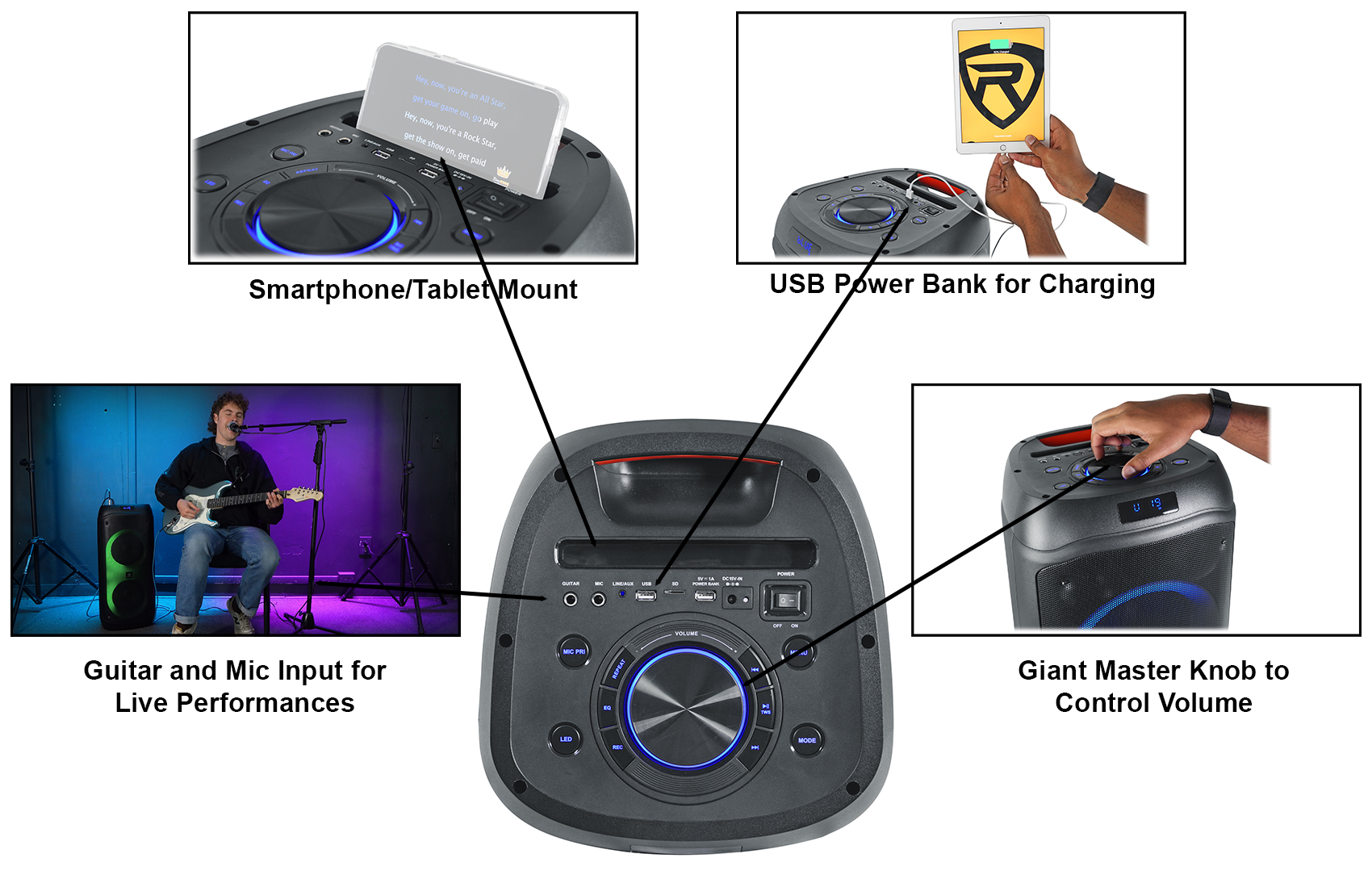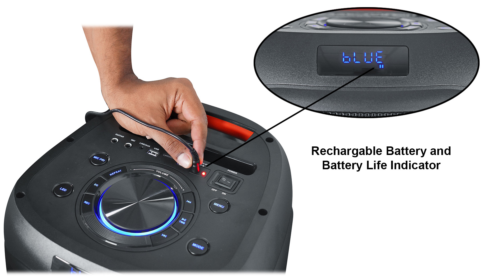 We offer many playback options so you can really get full use out of the speaker. We have a built in high quality Bluetooth 5.0 chip with a 50 foot Bluetooth range. There is also USB and memory card playback built in. There is a mic input for karaoke parties. There is also a guitar input if you want to jam using this speaker. We also added a dedicated USB to charge your phone or tablet. There is also a 3.5MM line input to connect any audio source.