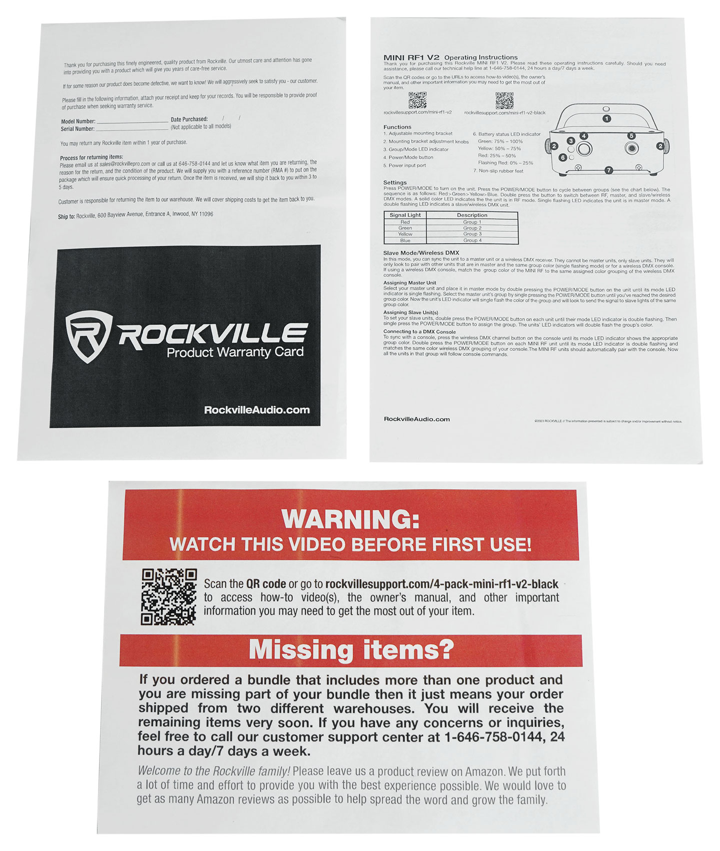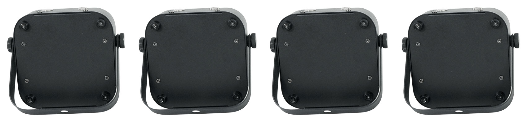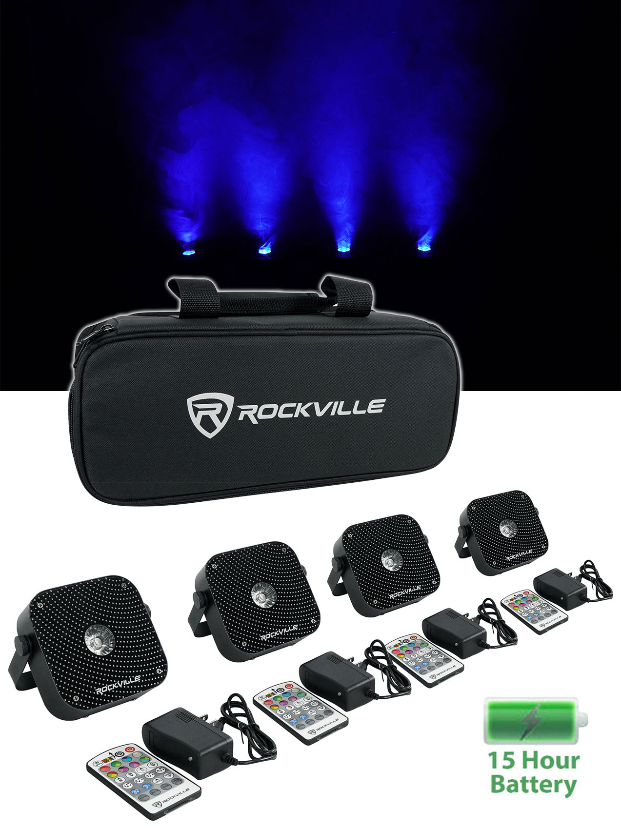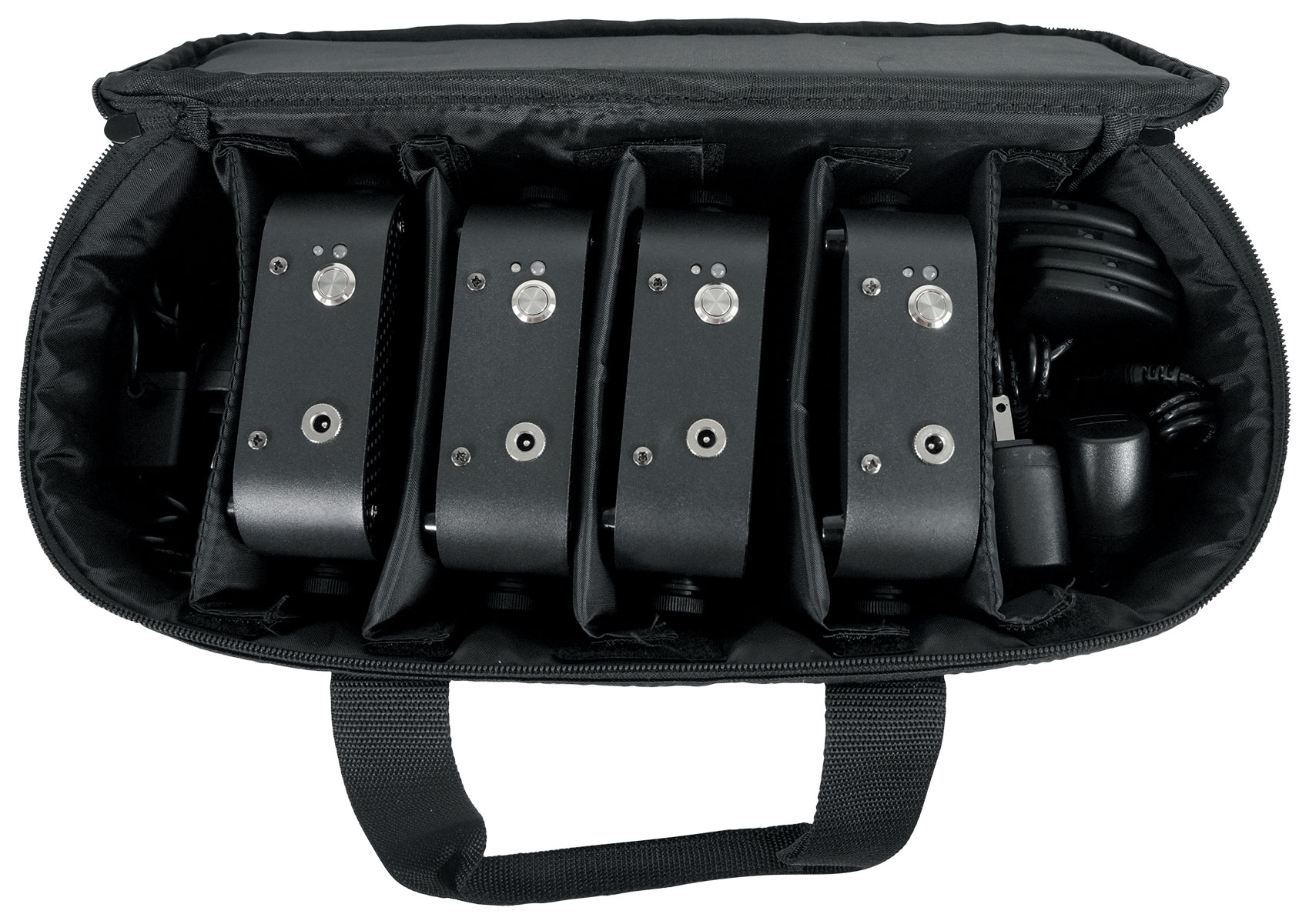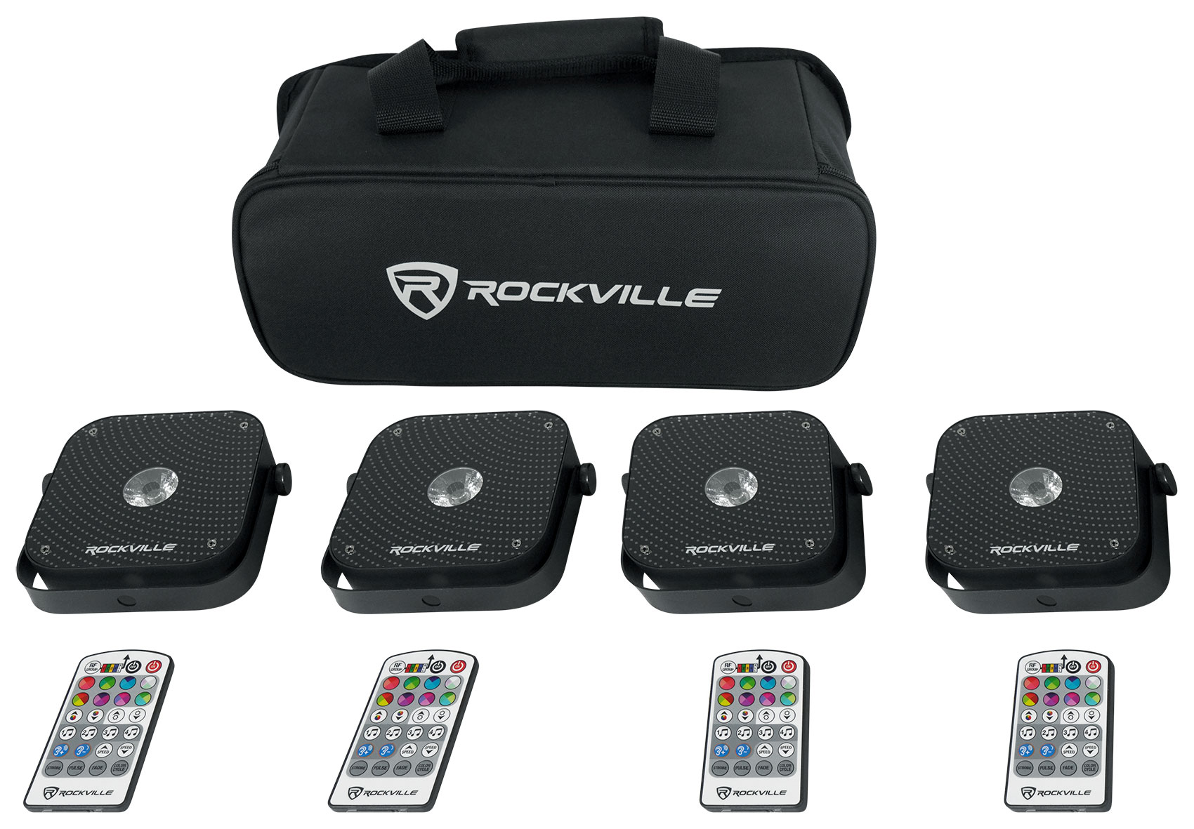 This bundle includes 4 of our MINI RF1 V2 lights and a high quality travel bag. The Mini RF1 V2 is a mini wash light that features a built-in rechargeable battery, 4 channel RF Remote Control, dimmer controls, strobe effect, 4 sound activated modes, and color mixing.